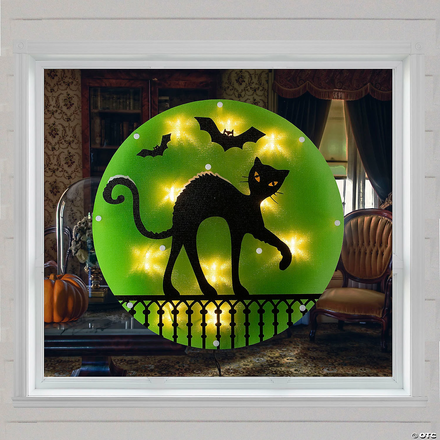 Light up your home this Halloween season with this round black cat window silhouette. The festive green will add a pop of color and is the perfect way to spruce up your decor with very little work. Add this decoration to your home for a bright touch of holiday spirit. Product Features: Color: clear bulbs / black wire. Number of bulbs: 10. Bulb size: mini. 22″ black lead cord. One-sided design. Durable and re-usable. Additional Product Features: Super bright bulbs. UL certified and approved for indoor use only. If one bulb burns out the rest will stay lit. Comes with replacement bulbs spare fuses and a suction cup for mounting the decoration. Contains 1 plug with end connector which allows you to stack multiple lighted items together (not to exceed 210 watts). Wire gauge: 22. UL certified and approved for indoor or outdoor use. 120 volts 60 hertz 0.08 amps 9.6 watts. Dimensions: 13.75″H x 13.75″W x .75″D. Material(s): plastic/wire/glass bulbs Special Shipping Information: This item ships separately from other items in your order. This item cannot ship to a P.O. Box. This item may be subject to additional processing days. Item is not eligible for expedited shipping. You may initiate a return for unused items within 30 days, if the items are in original packaging with all original materials included with the shipment.