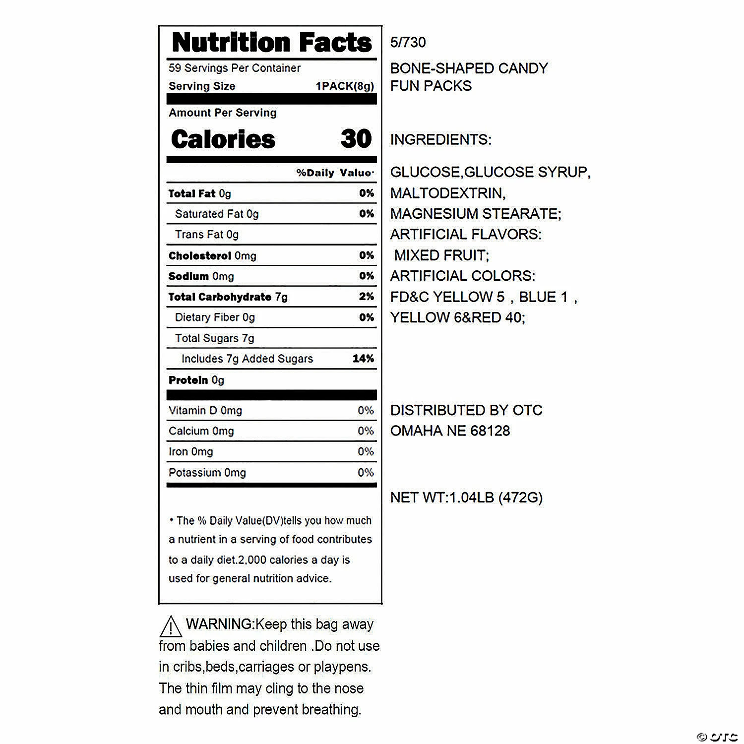 No bones about it, these assorted fruit-flavored skeleton candy packets are ideal for a variety of occasions! Drop them in trick-or-treat bags for some bone-chilling fun or add them to party favor bags. The perfect snack size for a little tasty treat after lunch or dinner! Shop even more Halloween candy and treats on our site. (Approx. 14 pcs. per pkg., 59 pkgs. per unit, 1 lb.) Fat-free. Nut-free. Gluten-free. Candy is non-returnable. For more information, visit our “Return Policy” page located on our website. • Ingredient, nutrition, allergen and other product information are provided on our Web and Mobile sites for reference purpose only, without warranty or representation as to accuracy. Manufacturers adjust their labeling regularly and are solely responsible for the accuracy of the information. For general questions concerning these items, please contact our customer service at 800-228-0475.