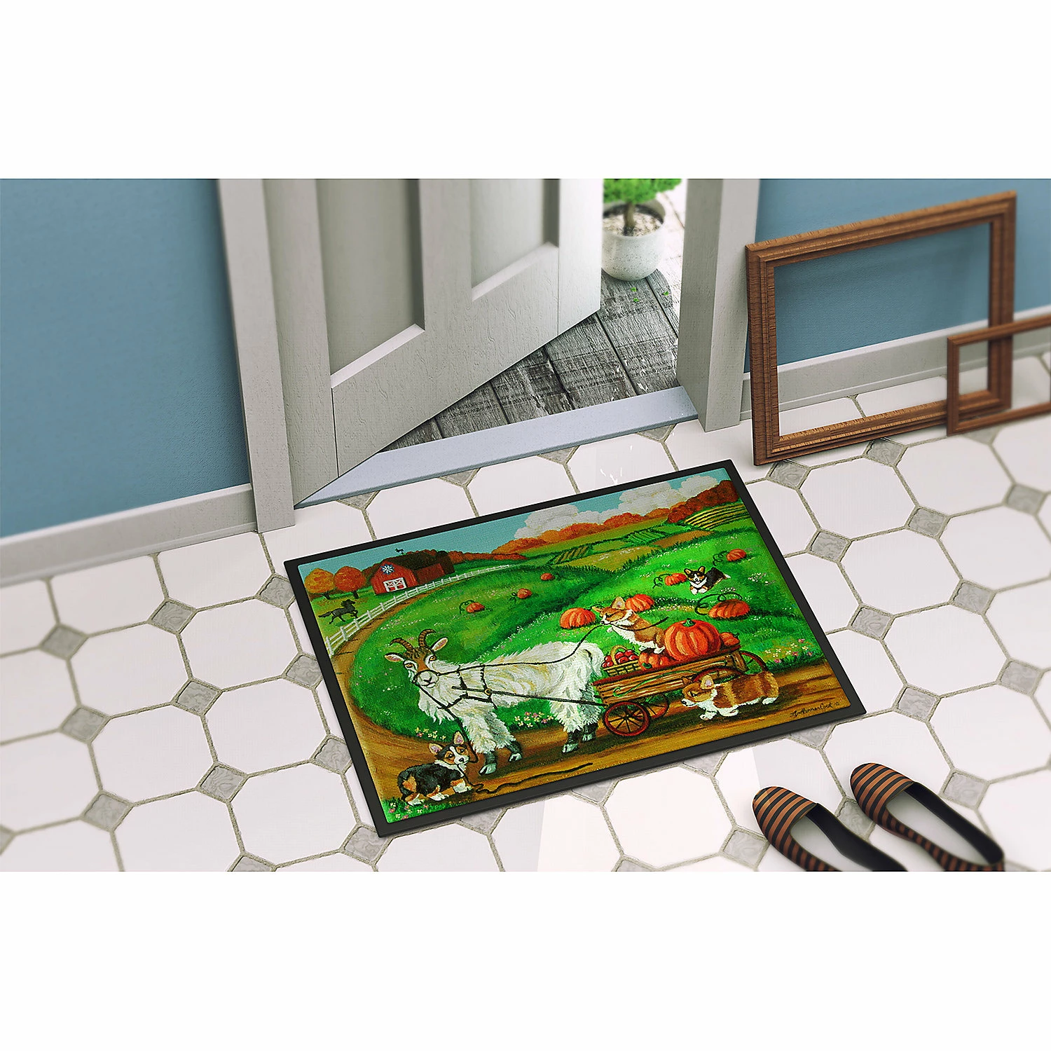 Corgi Pumpkin Ride with Goat Indoor or Outdoor Mat 24×36. Indoor or Outdoor Mat 24×36 featuring breed specific Corgi artwork. Welcome your family and friends with this Artwork mat in full color. This action backed mat with hold up in almost any weather condition. This door mat measures about 24 inches by 36 inches and has a black binding tape to hold it’s many layers together. The top layer is a polyester felt that is dyed with the image that you see on the mat. The next couple of layers give the mat stability and the bottom of the mat is rubber that has been stamped to help prevent slipping. To clean this mat, hose it off with a water hose or use a powerwasher. Do not use any cleaner that produces suds. This Doormat is from Caroline’s Treasures Dogs category of products.