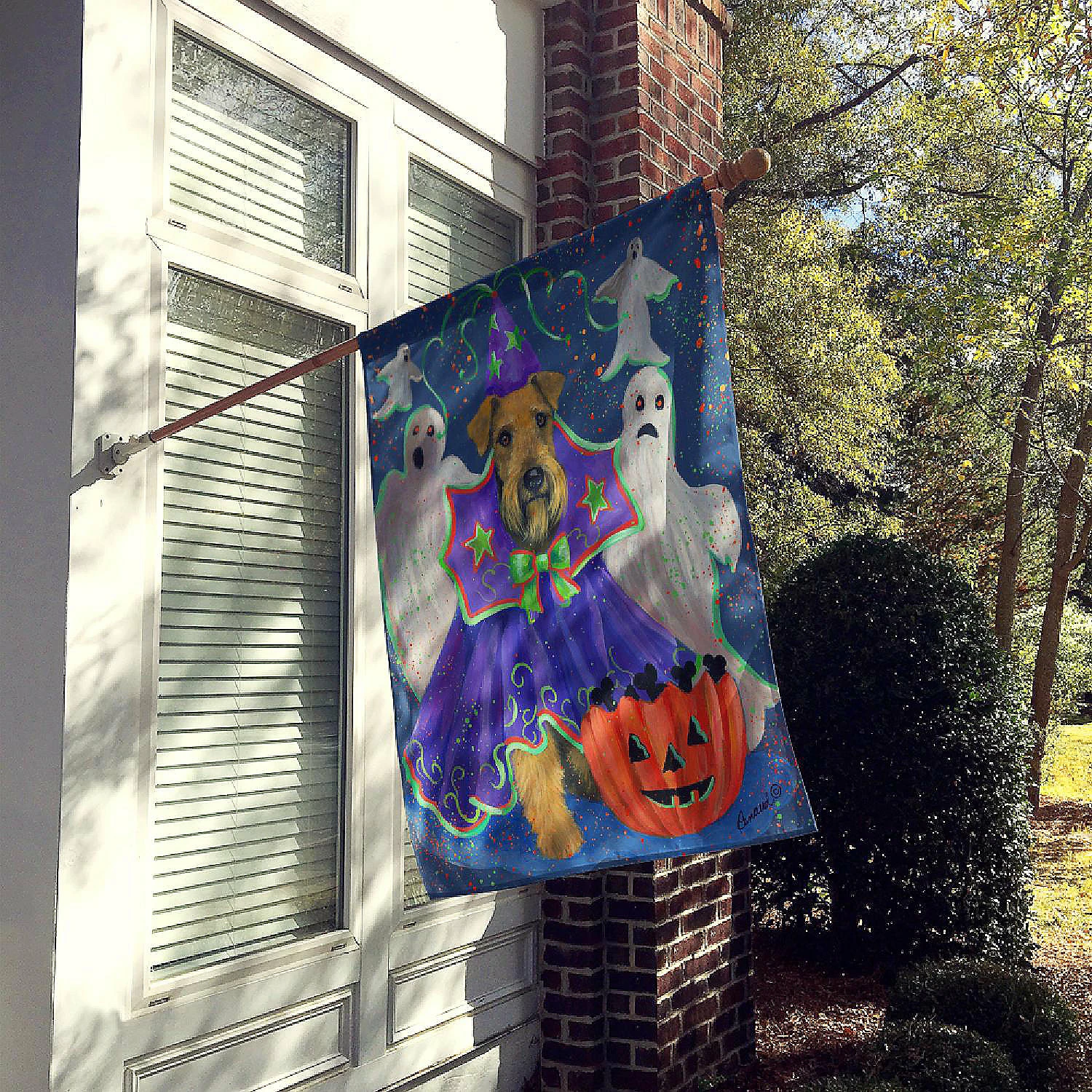 Airedale Boo Hoo Halloween Flag Canvas House Size. Flag Canvas House Size featuring breed specific Airedale Terrier artwork. Celebrate Halloween with this Halloween Large Flag. Heavy Duty Polyester House Size Decorative Sleeve Pole Flag. Each flag measures approximately 28 x 40 inches. This flag is sewn and made one at a time and may vary slightly in size. This is a sleeve pole flag that will fit a standard decorative flag pole. The flag pole and bracket are not included and should be purchased seperately. The flag is printed on both sides of the fabric with one side mirroring the other side. Each flag is printed in full color and they dyes are heat set for durability. This Large Flag is from Caroline’s Treasures Dogs category of products.