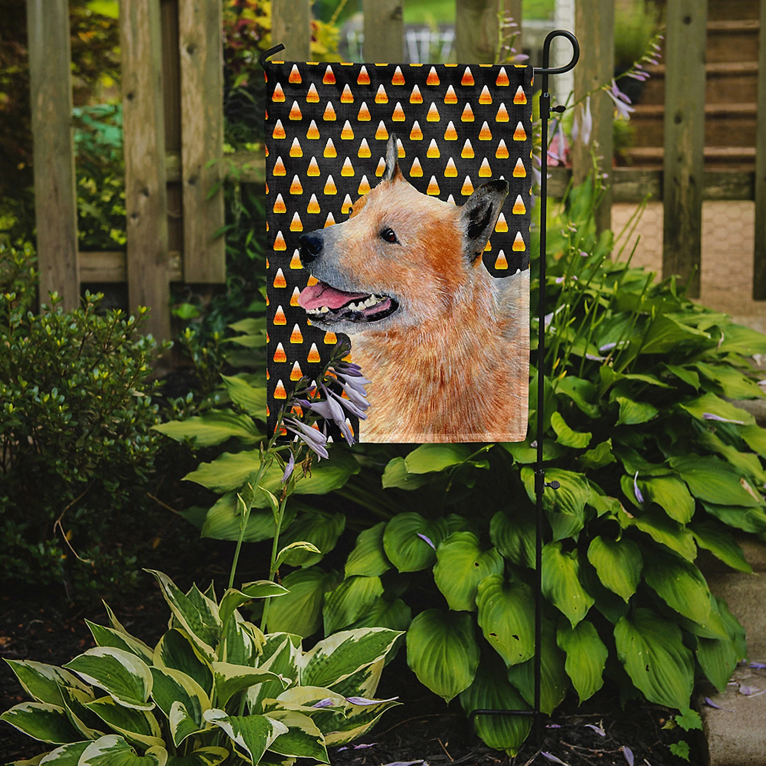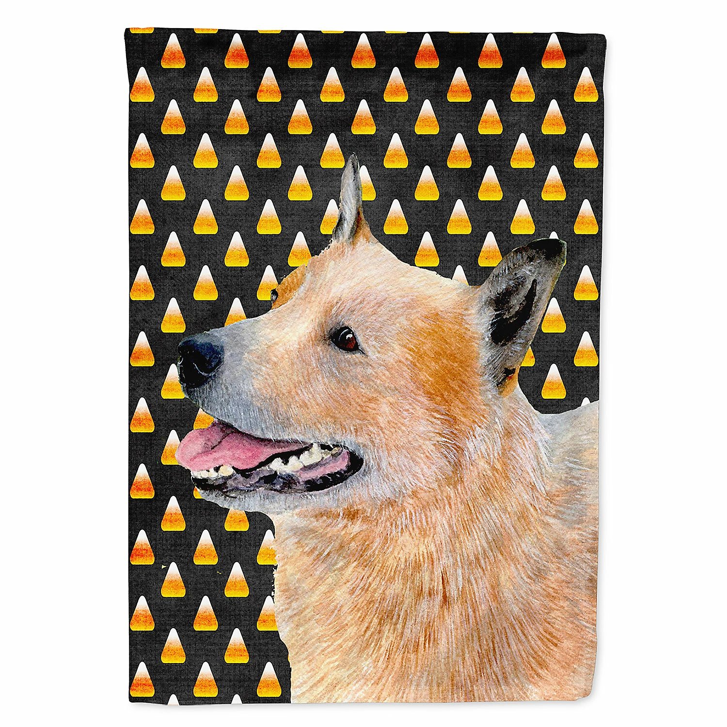 Australian Cattle Dog Candy Corn Halloween Portrait Flag Garden Size. Flag Garden Size featuring breed specific Australian Cattle Dog artwork. Celebrate Halloween with this Halloween Garden Flag. Artwork for your garden, patio or yard. This is a thick Double sided garden flag made from two pieces of polyester fabric. This 2 ply garden size flag is water resistant and weather proof. Words on the flag can be read correctly on both sides of the garden flag. Heavier than most other garden flags available. This flag will hold up in wind, rain and snow. Make your personal statement in your outdoor decor with this colorful quality garden flag. The flag measures approximately 11 1/4 inches x 15 1/2 inches. The flag has a 1 1/2 inch sleeve sewn in to allow you to attach the flag to any standard garden flag stand or garden size porch hanger. The garden stand is sold seperately. This Garden Flag is from Caroline’s Treasures Dogs category of products.