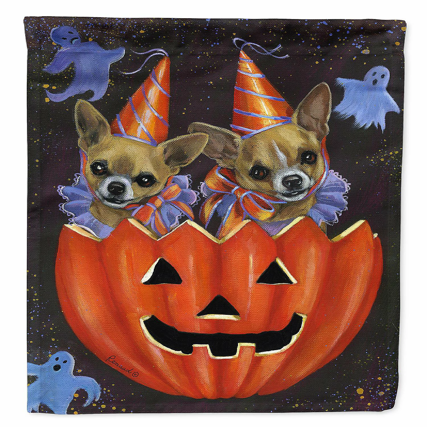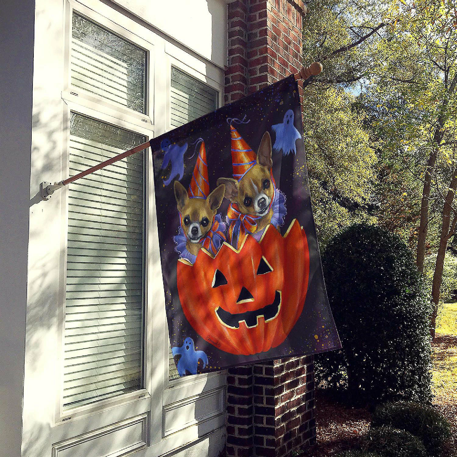 Chihuahua Halloweenies Flag Canvas House Size. Flag Canvas House Size featuring breed specific Chihuahua artwork. Celebrate Halloween with this Halloween Large Flag. Heavy Duty Polyester House Size Decorative Sleeve Pole Flag. Each flag measures approximately 28 x 40 inches. This flag is sewn and made one at a time and may vary slightly in size. This is a sleeve pole flag that will fit a standard decorative flag pole. The flag pole and bracket are not included and should be purchased seperately. The flag is printed on both sides of the fabric with one side mirroring the other side. Each flag is printed in full color and they dyes are heat set for durability. This Large Flag is from Caroline’s Treasures Dogs category of products.