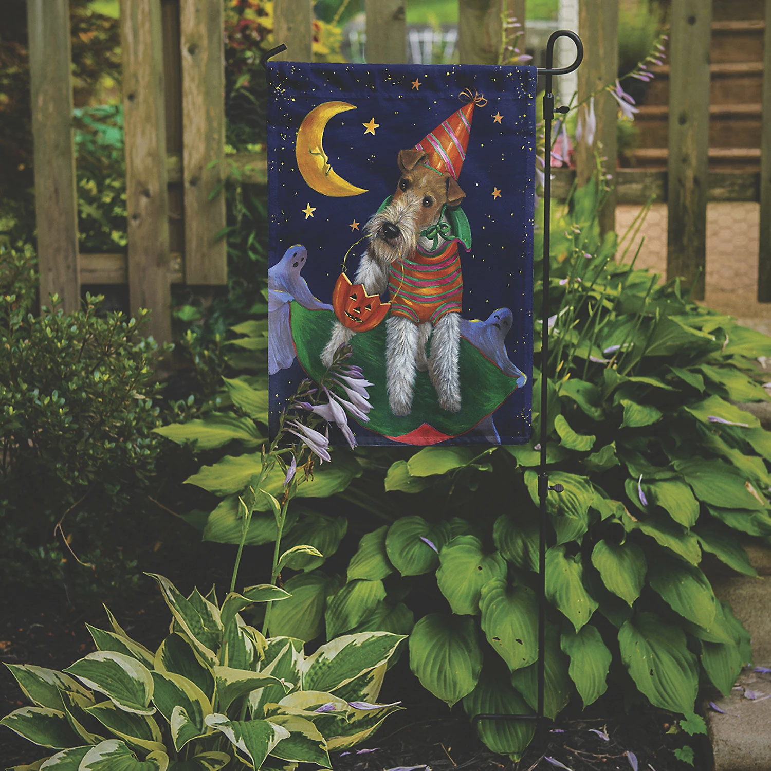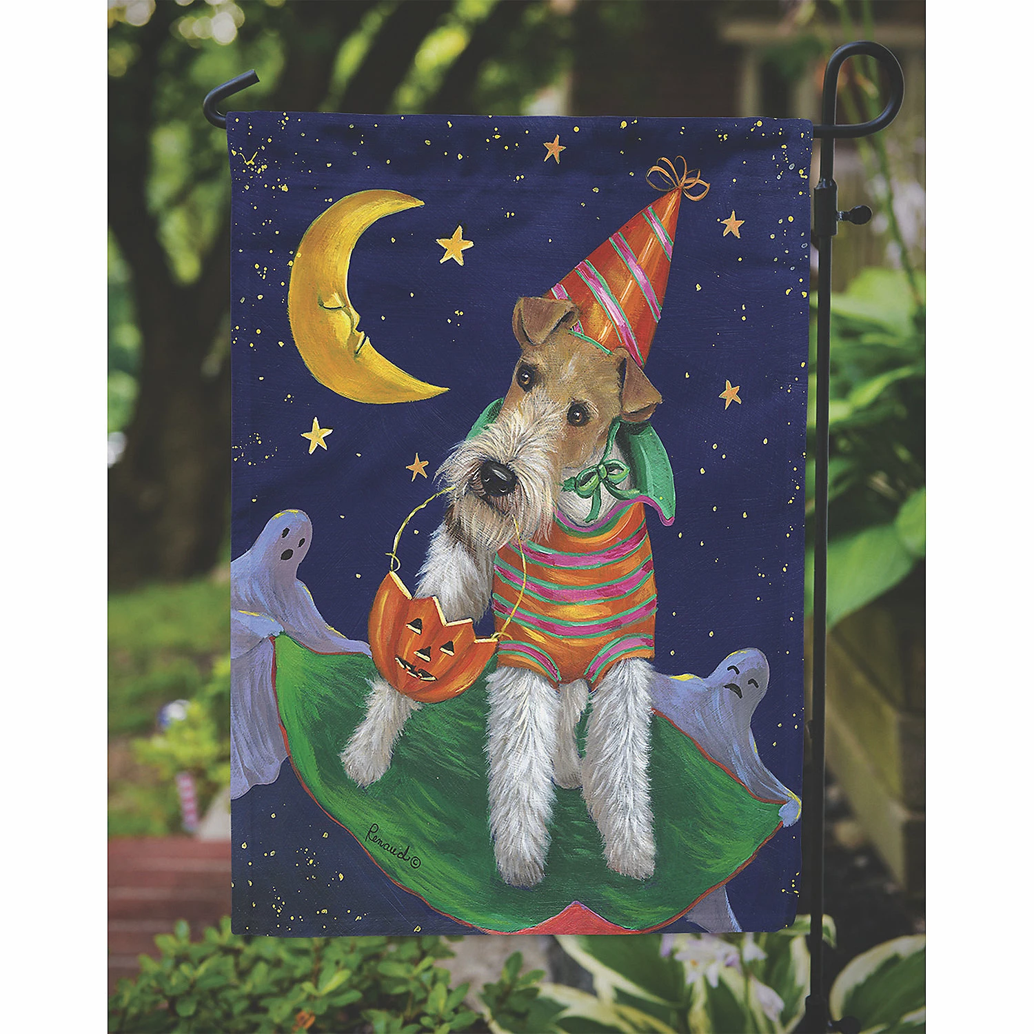 Fox Terrier Halloween Trick or Treat Flag Garden Size. Flag Garden Size featuring breed specific Fox Terrier artwork. Celebrate Halloween with this Halloween Garden Flag. Artwork for your garden, patio or yard. This is a thick Double sided garden flag made from two pieces of polyester fabric. This 2 ply garden size flag is water resistant and weather proof. Words on the flag can be read correctly on both sides of the garden flag. Heavier than most other garden flags available. This flag will hold up in wind, rain and snow. Make your personal statement in your outdoor decor with this colorful quality garden flag. The flag measures approximately 11 1/4 inches x 15 1/2 inches. The flag has a 1 1/2 inch sleeve sewn in to allow you to attach the flag to any standard garden flag stand or garden size porch hanger. The garden stand is sold seperately. This Garden Flag is from Caroline’s Treasures Dogs category of products.