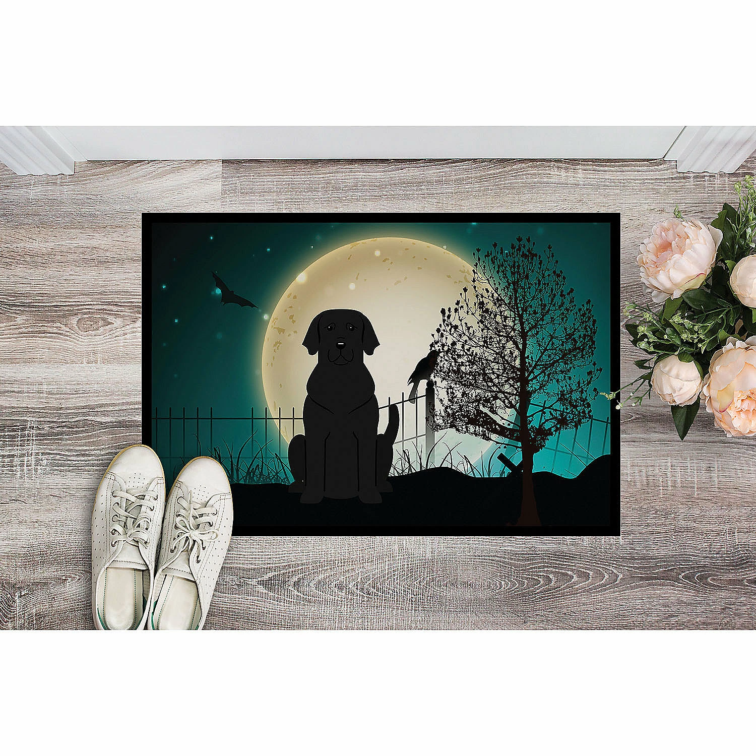 Halloween Scary Black Labrador Indoor or Outdoor Mat 24×36. Indoor or Outdoor Mat 24×36 featuring breed specific Labrador Retriever artwork. Celebrate Halloween with this Halloween Doormat. Welcome your family and friends with this Artwork mat in full color. This action backed mat with hold up in almost any weather condition. This door mat measures about 24 inches by 36 inches and has a black binding tape to hold it’s many layers together. The top layer is a polyester felt that is dyed with the image that you see on the mat. The next couple of layers give the mat stability and the bottom of the mat is rubber that has been stamped to help prevent slipping. To clean this mat, hose it off with a water hose or use a powerwasher. Do not use any cleaner that produces suds. This Doormat is from Caroline’s Treasures Dogs category of products.