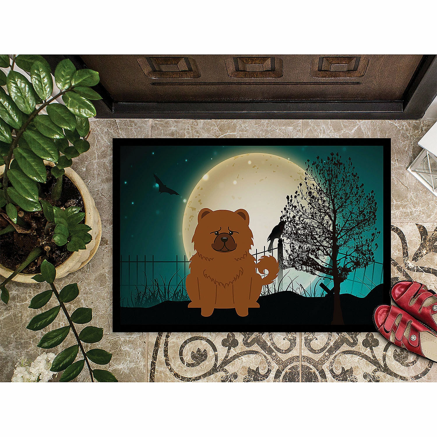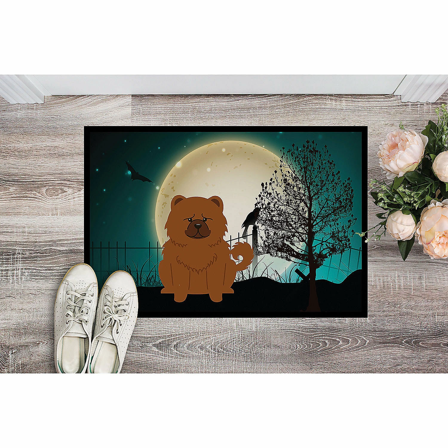 Halloween Scary Chow Chow Red Indoor or Outdoor Mat 24×36. Indoor or Outdoor Mat 24×36 featuring breed specific Chow Chow artwork. Celebrate Halloween with this Halloween Doormat. Welcome your family and friends with this Artwork mat in full color. This action backed mat with hold up in almost any weather condition. This door mat measures about 24 inches by 36 inches and has a black binding tape to hold it’s many layers together. The top layer is a polyester felt that is dyed with the image that you see on the mat. The next couple of layers give the mat stability and the bottom of the mat is rubber that has been stamped to help prevent slipping. To clean this mat, hose it off with a water hose or use a powerwasher. Do not use any cleaner that produces suds. This Doormat is from Caroline’s Treasures Dogs category of products.