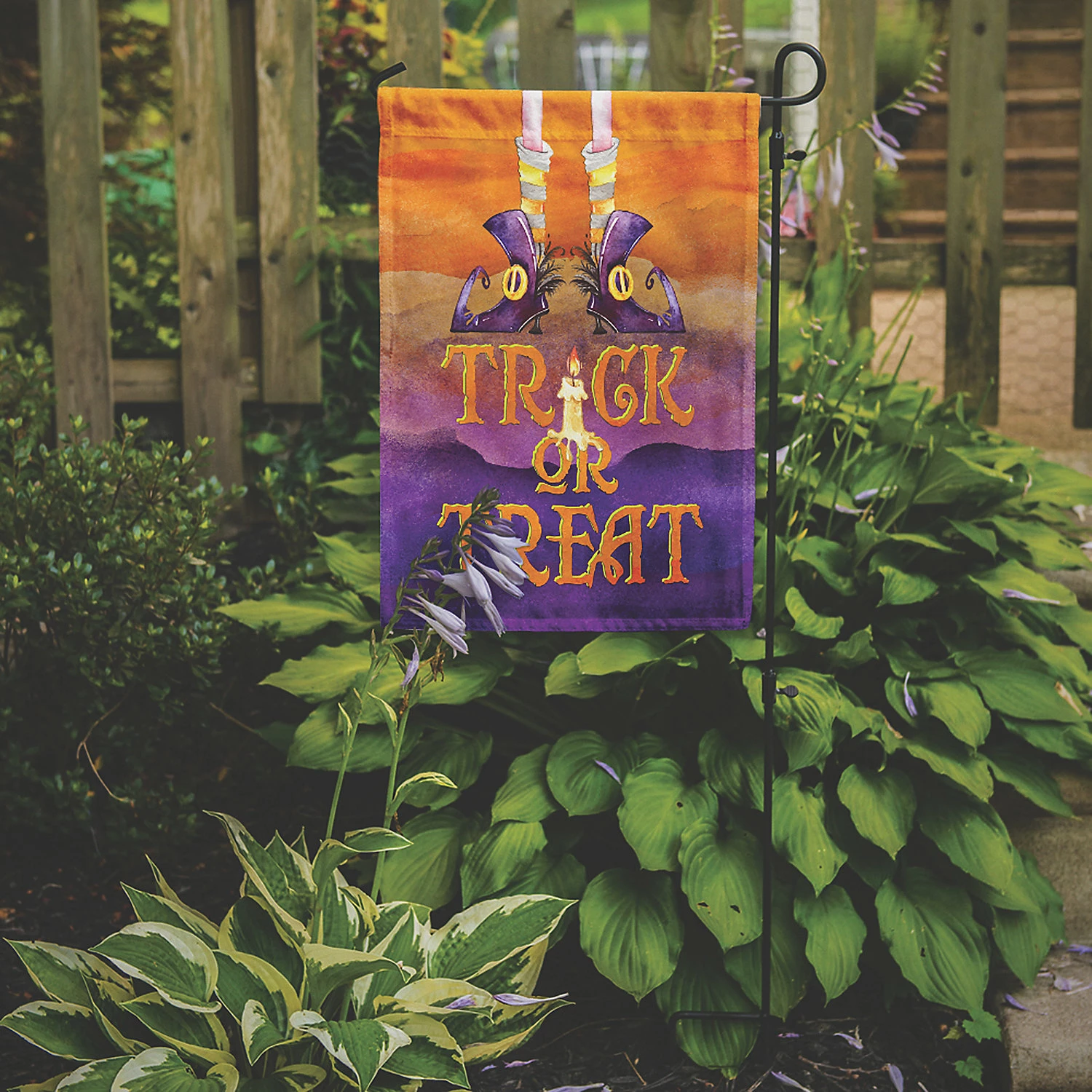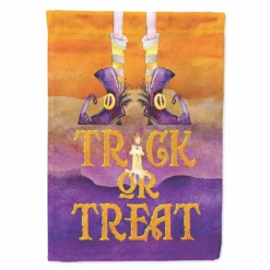 Halloween Trick Witches Feet Flag Garden Size. Celebrate Halloween with this Halloween Garden Flag. Artwork for your garden, patio or yard. This is a thick Double sided garden flag made from two pieces of polyester fabric. This 2 ply garden size flag is water resistant and weather proof. Words on the flag can be read correctly on both sides of the garden flag. Heavier than most other garden flags available. This flag will hold up in wind, rain and snow. Make your personal statement in your outdoor decor with this colorful quality garden flag. The flag measures approximately 11 1/4 inches x 15 1/2 inches. The flag has a 1 1/2 inch sleeve sewn in to allow you to attach the flag to any standard garden flag stand or garden size porch hanger. The garden stand is sold seperately. This Garden Flag is from Caroline’s Treasures Seasonal category of products.