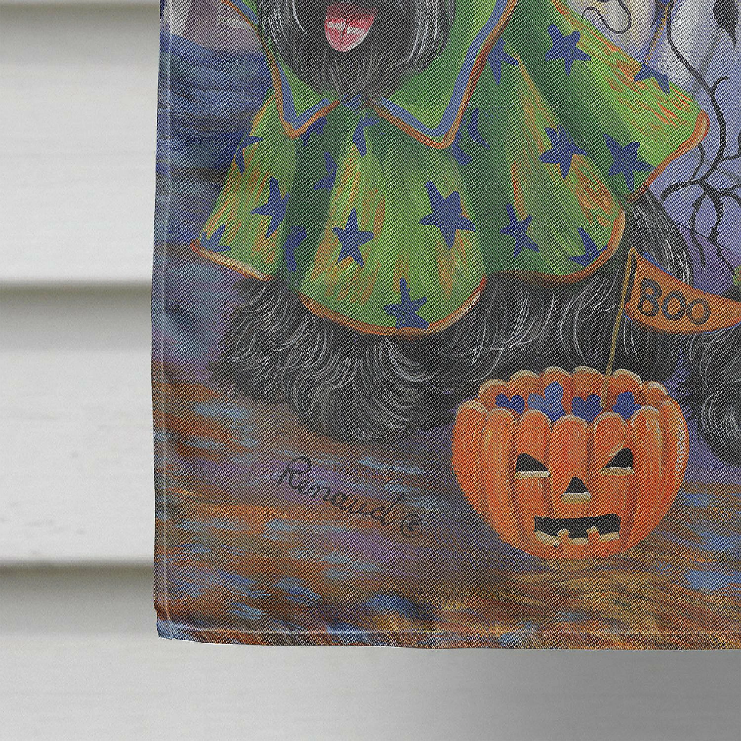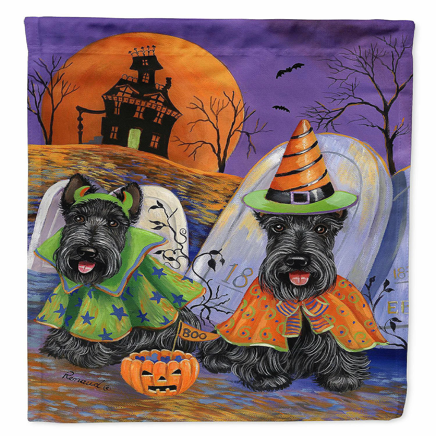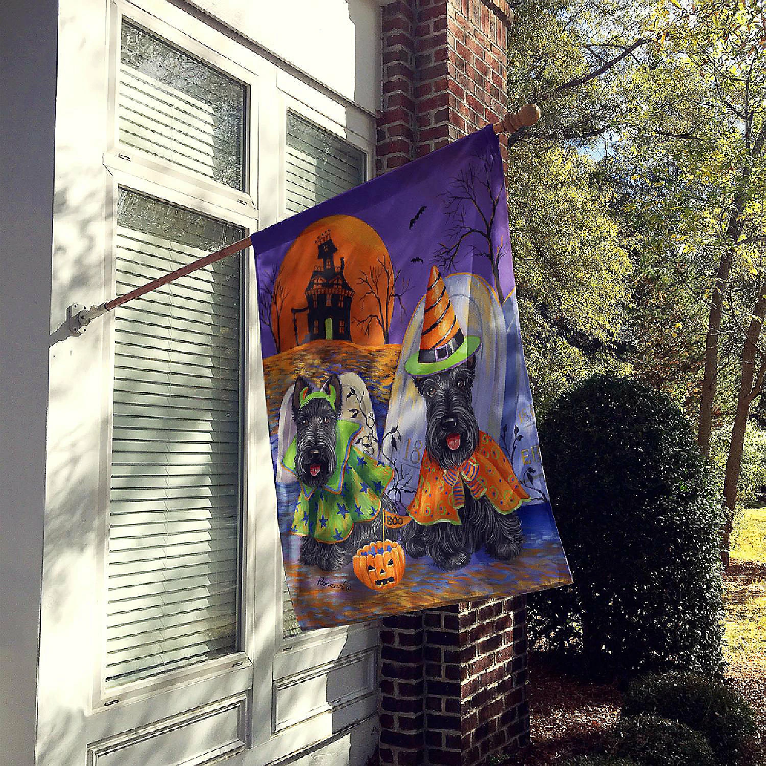Scottie Halloween Haunted House Flag Canvas House Size. Flag Canvas House Size featuring breed specific Scottish Terrier artwork. Celebrate Halloween with this Halloween Large Flag. Heavy Duty Polyester House Size Decorative Sleeve Pole Flag. Each flag measures approximately 28 x 40 inches. This flag is sewn and made one at a time and may vary slightly in size. This is a sleeve pole flag that will fit a standard decorative flag pole. The flag pole and bracket are not included and should be purchased seperately. The flag is printed on both sides of the fabric with one side mirroring the other side. Each flag is printed in full color and they dyes are heat set for durability. This Large Flag is from Caroline’s Treasures Dogs category of products.