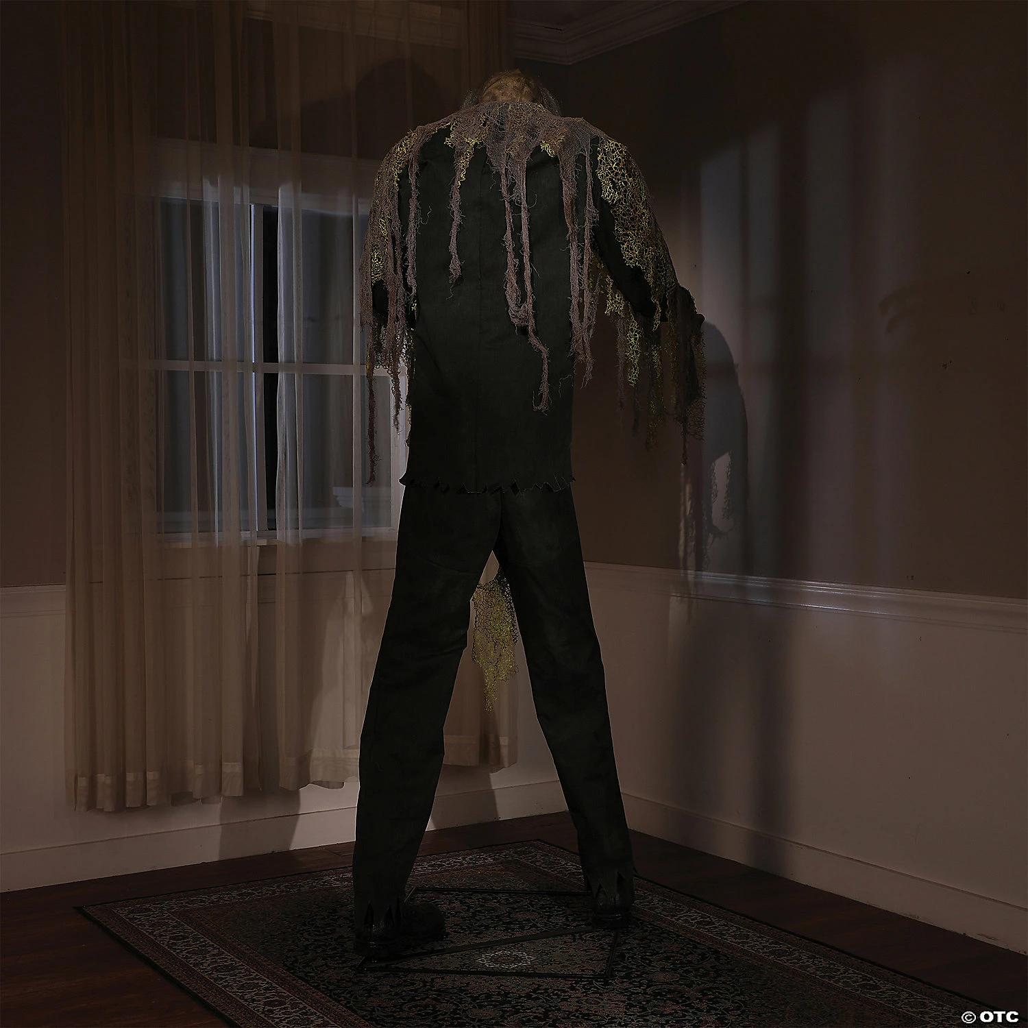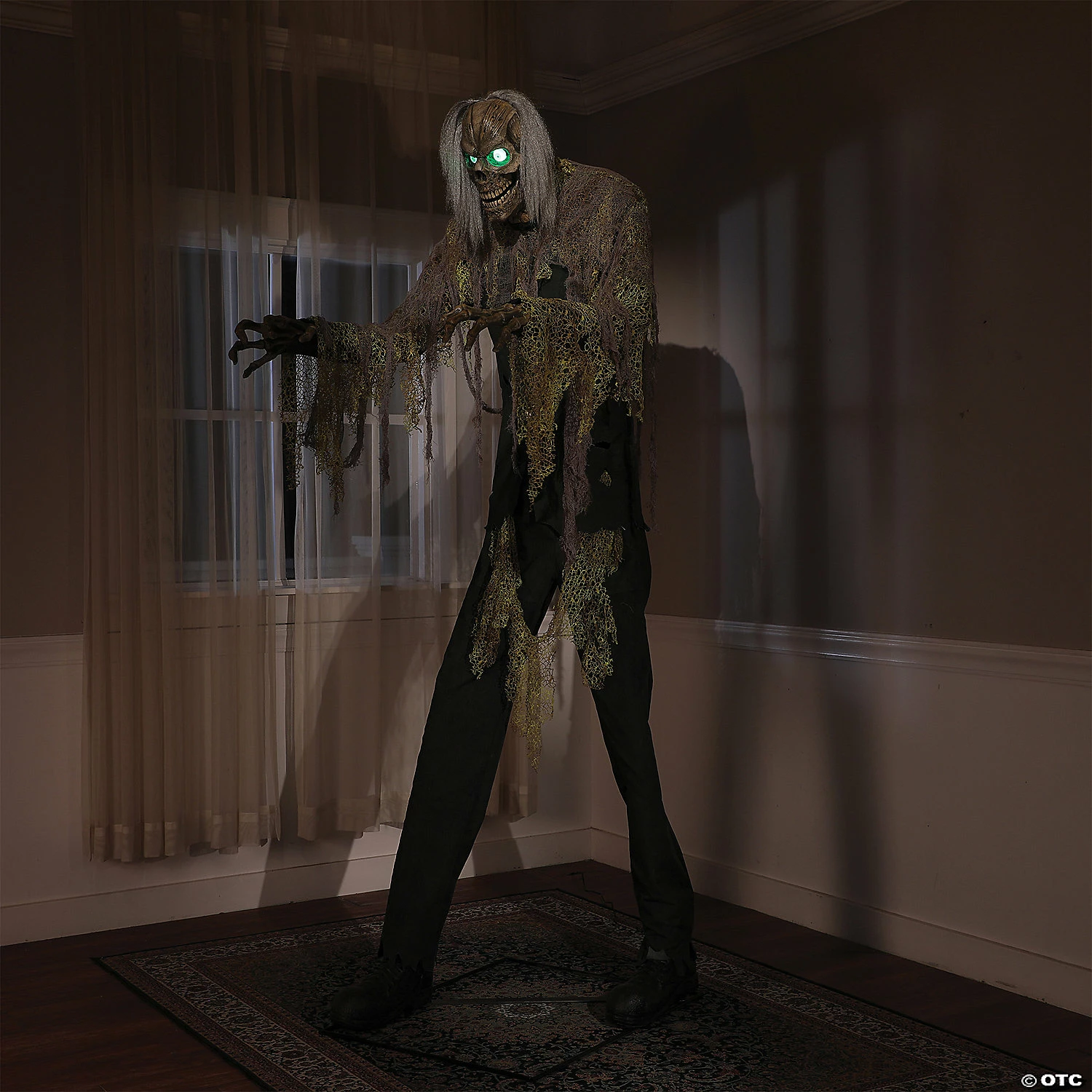Lurking in the depths of your basement an undead terror awakens. The 7-foot Cellar Dweller Animated Prop covered in tattered rags has Glowing Green Eyes that pierce through the darkness, as his Head Turns and Mouth moves. His rough dry Voice speaks in a deathly tone as drips of water echo in the background. He speaks one of four scary phrases:Phrase #1: “This dank old house is oozing with foul stench of rotten souls. Its kept me thriving, as long as I hide down here with the rats. I’m happy to share with you, if you have the stomach for it! Huh huh huh!”Phrase #2: “Uuuuhhhh&hellip I ooze with the spirit of Halloween. Drip, drip drip it goes. Uuuuhhh&hellip”Phrase #3: “This place drips with doomed spirits. Released from their burial graves, they are searching for fresh victims to haunt. There is no way of hiding from them but go ahead and try! Huh huh”Phrase #4: “The syrupy, sick damp of the cellar has made me a moldy mess. But no matter. I’ve grown fond of the wet stench,and wantto share it with you! Uuuuhhhh!”His Arms also raise and lower, making his decrepit Boney Hands claw away at the darkness as an infrared sensor waits for the living to make a wrong move, activating his presence. Three activation options include, Steady-On, Infra-red Sensor, or Step-Here Pad. There is also a volume control so you can adjust to your surroundings. Constructed of durable metal rods that snap together, this piece is easily assembled in less than 30 minutes.The included Universal Adapter has 4 interchangeable plugs, and works in the USA, UK, Germany, and Australia.