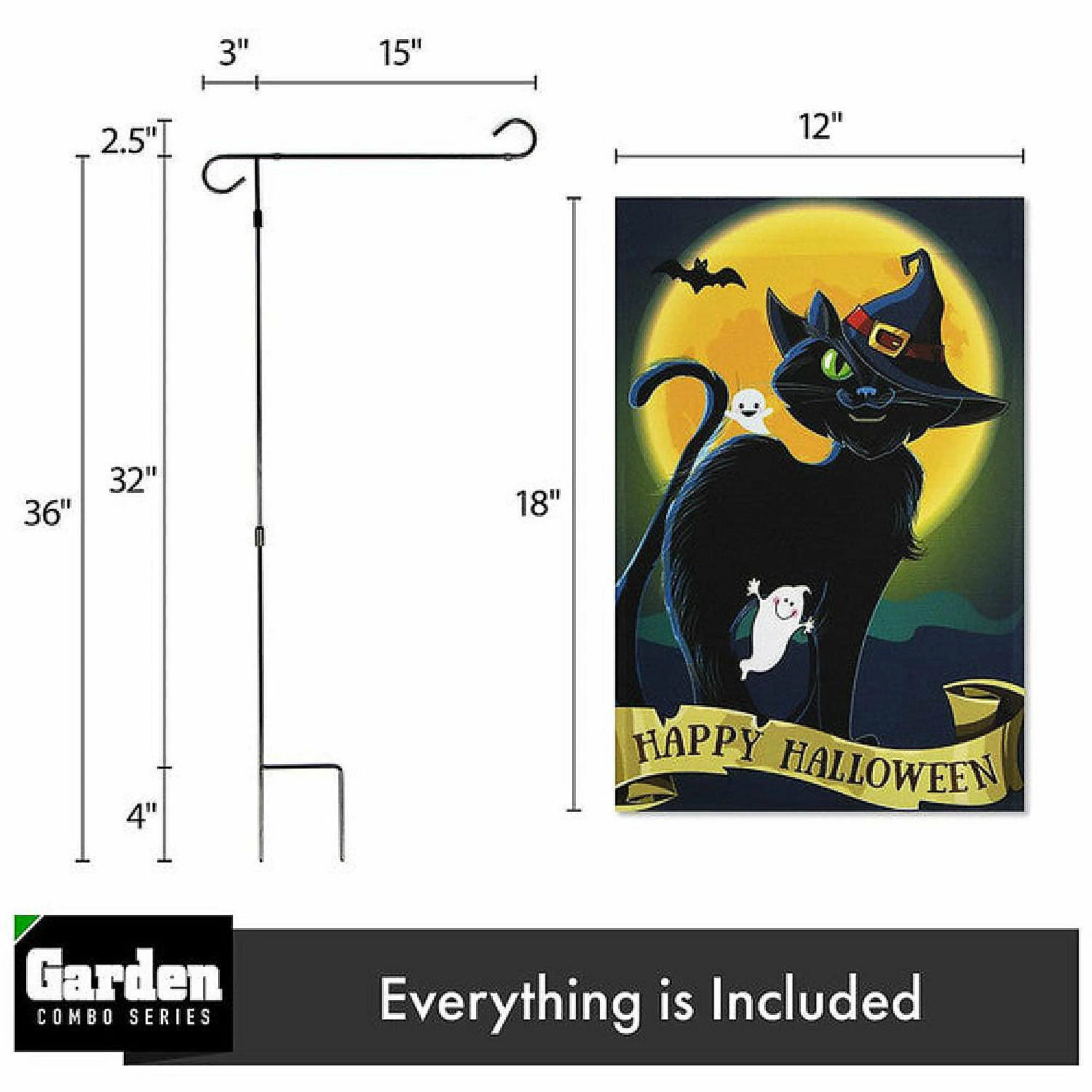 SPECS: Garden Flag Stand is 36″ x 16″ after assembly from black iron 3 piece set; Happy Halloween Black Cat Moon flag is a 12″x18″ size vertical polyester garden flag. Imported, 100% Polyester Flag