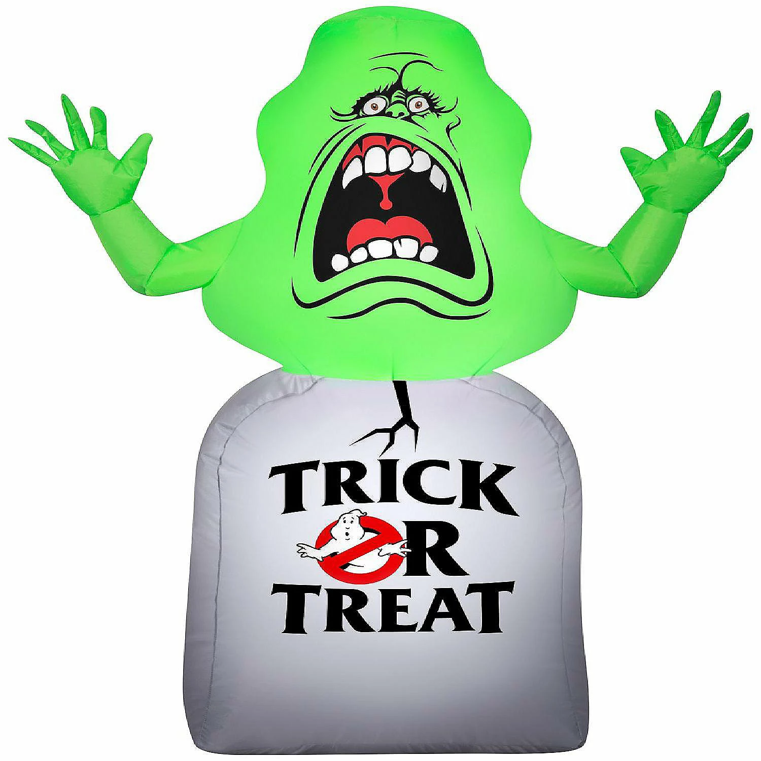 Fans of Ghostbusters will love this Airblown® Inflatable Slimer on a tombstone. Accented with the Ghostbusters logo in a “Trick or Treat” sentiment, our Slimer inflatable makes a spooktacular addition to your Halloween decorations. Setup is super simple. Just plug it in, stake it down and watch the magic unfold. Display this Ghostbusters Halloween decoration as a standalone or combine it with other Airblown Inflatables to create a custom scene.