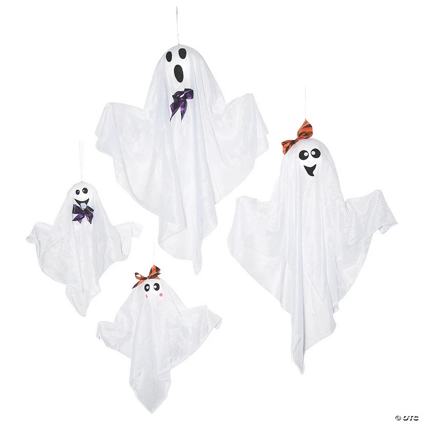 These friendly ghost decorations are perfect for hanging up in classrooms, offices and at home. This 4-piece hanging ghost family set is great for creating a not-so-scary feel. Little ones will love seeing these cute ghosts hanging from the ceiling, doors and windows. The Ghost Family Set includes a set of four ghosts. Each ghost has a different facial expression and ribbon detailing. Two ghosts measure 17.5” L x 10” W and the other two ghosts measure 12” L x 10” W.Special Shipping Information: This item ships separately from other items in your order. This item cannot ship to a P.O. Box. This item may be subject to additional processing days.ITEM IS NOT ELIGIBLE FOR EXPEDITED SHIPPING