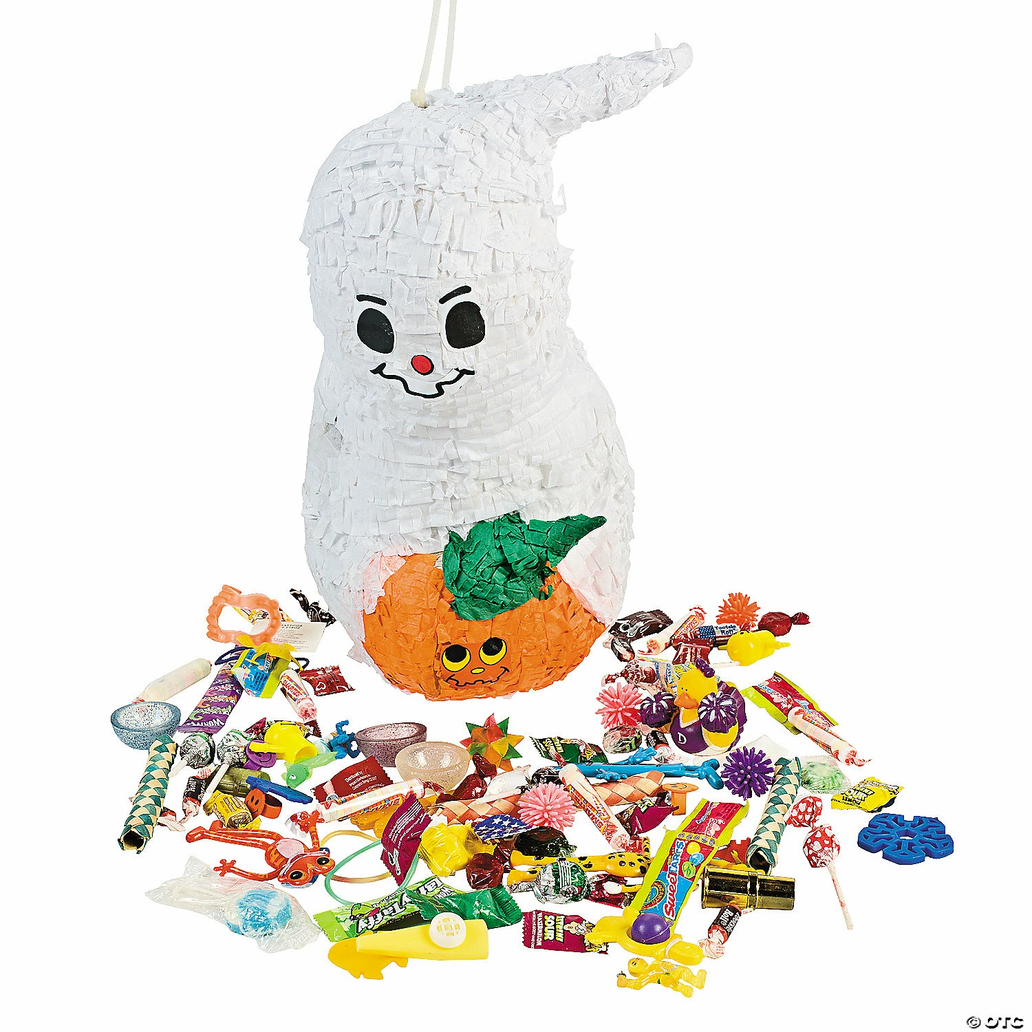 Ghost Piñata. Fill this spooky papier-mâché ghost piñata with your own candy or small toys for the perfect Halloween party game! Kids love to take a swing at this friendly target! Fun for a Halloween party or birthday celebration! A piñata can be used by a charity at an annual fundraiser — stuff the piñata with donated gift certificates and have supporters buy a swing at a prize! 8 1/2″ x 15″ Stuffed with paper to retain shape, remove before filling. Piñata stick and toy & candy assortment sold separately.