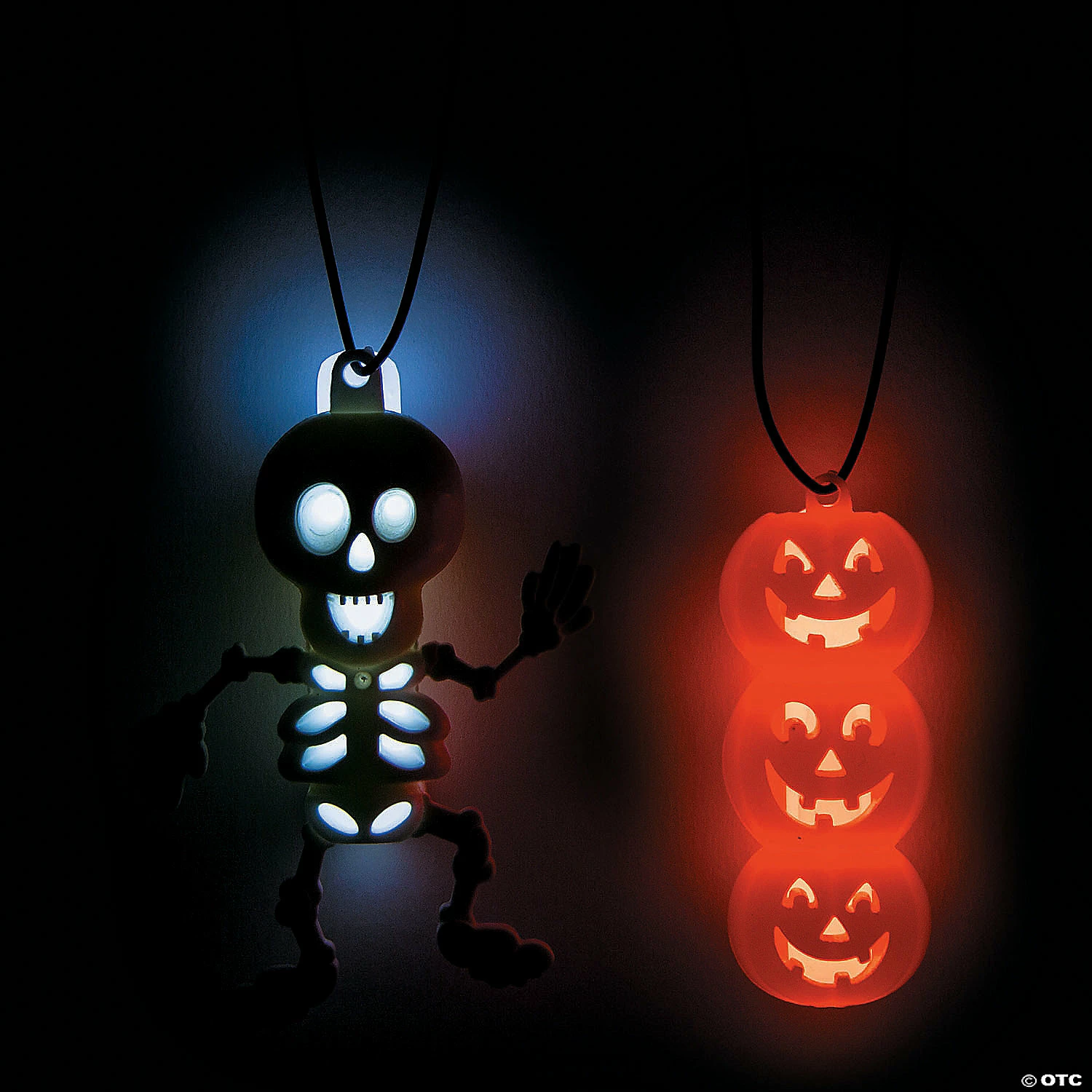 These Halloween necklaces are sure to make you grin and glow! A great addition to Halloween supplies, these necklaces make great candy alternatives for trick-or-treaters and they’re perfect Halloween party favors. Hand them out to everyone in your child’s crew! Just snap and insert the 2″ glow stick for a fun look. Simple assembly required. Plastic. 3″ charms on 33″ cords.
