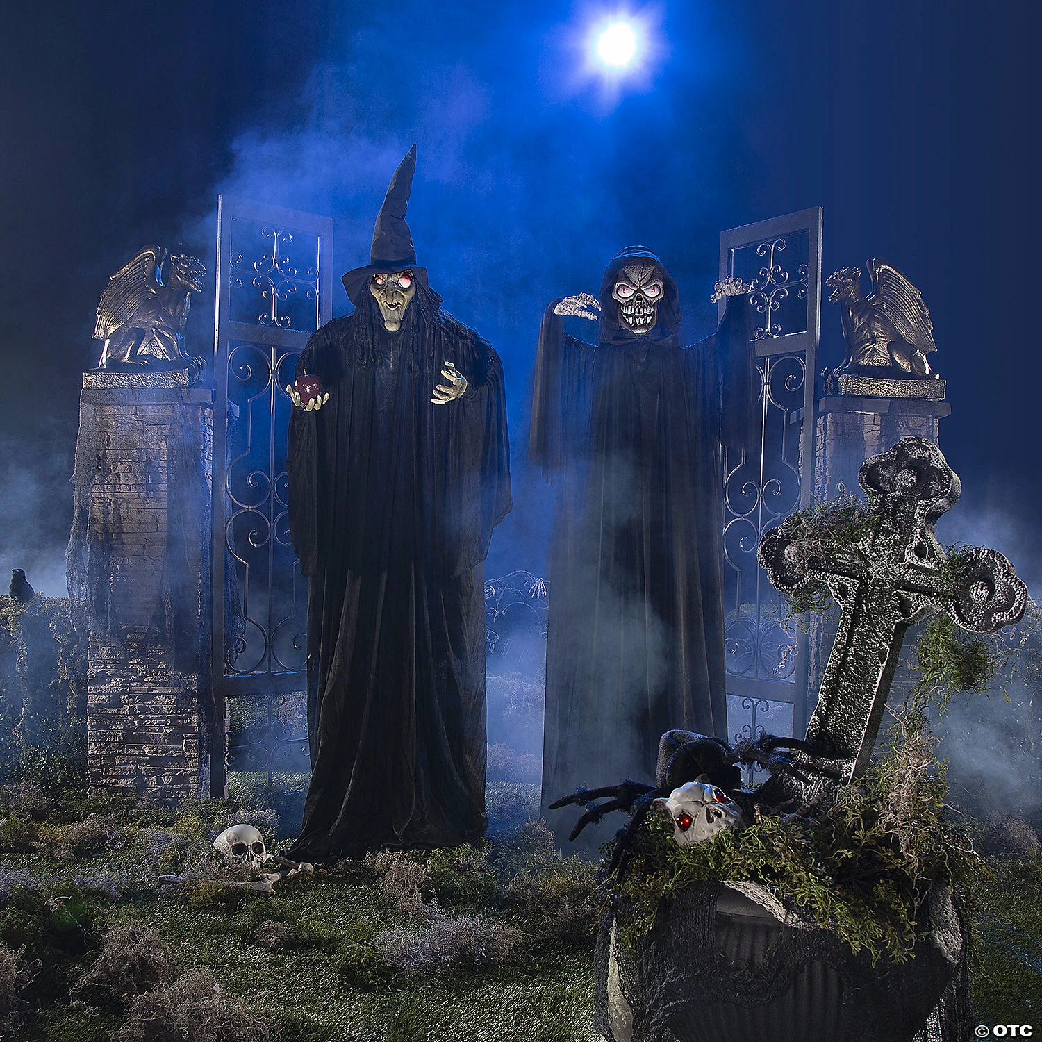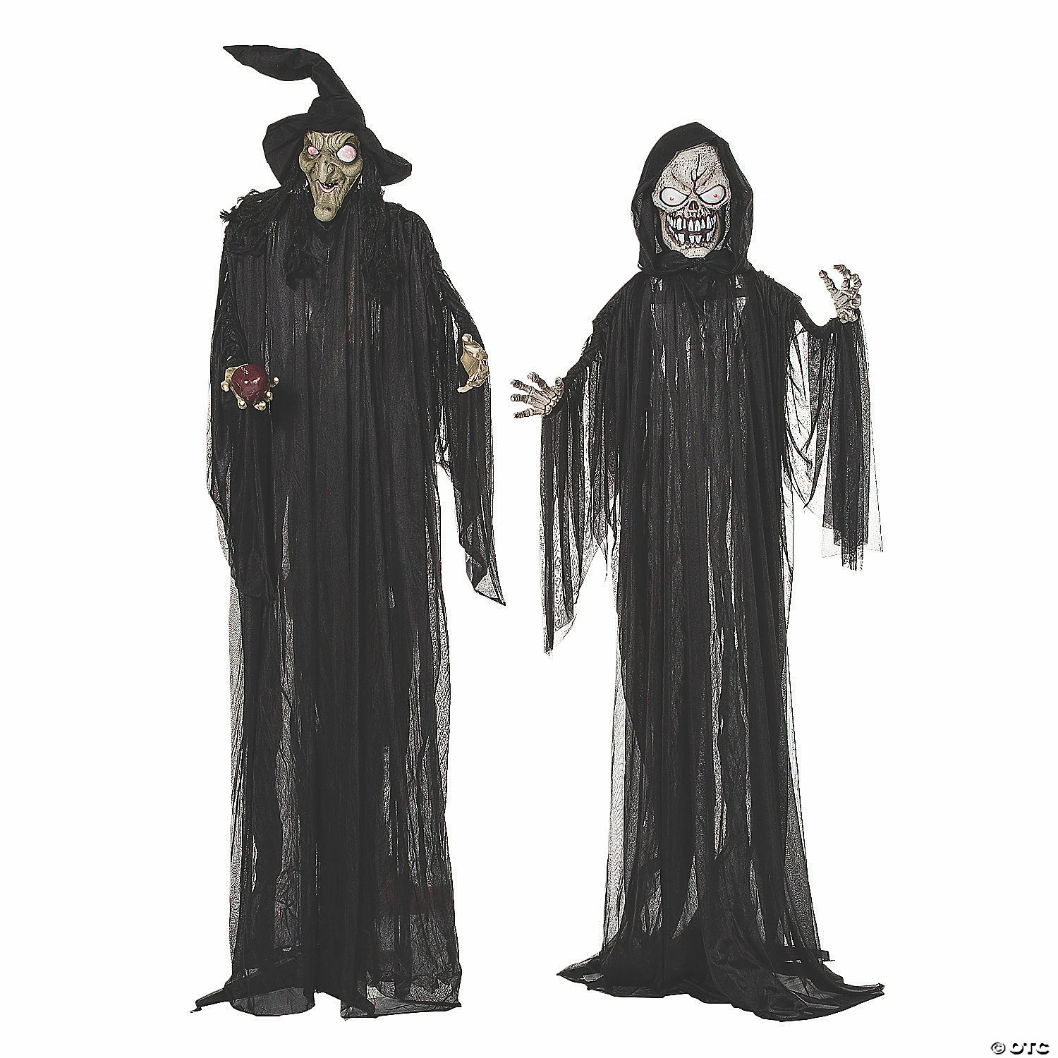 Double the fear factor with this creeptastic standing duo! The ultimate Halloween décor for use in your haunted house attraction, Halloween party supplies or covered outdoor Halloween decorations, these figures are sure to frighten the pants off anyone with enough guts to dare a closer look. (2 pcs. per set)Includes:• 1 Plastic Standing Witch with Red Apple Halloween Decoration (Features flashing red eyes and loud noise activation. Arms stretched out, approx. 5 ft. 3″ x 7 ft. 9″. Simple assembly required. Requires 3 “AAA” batteries, not included.)• 1 Plastic Standing Animated Reaper (Features glowing red eyes. 7 ft. Requires 2 “AA” batteries, not included.)