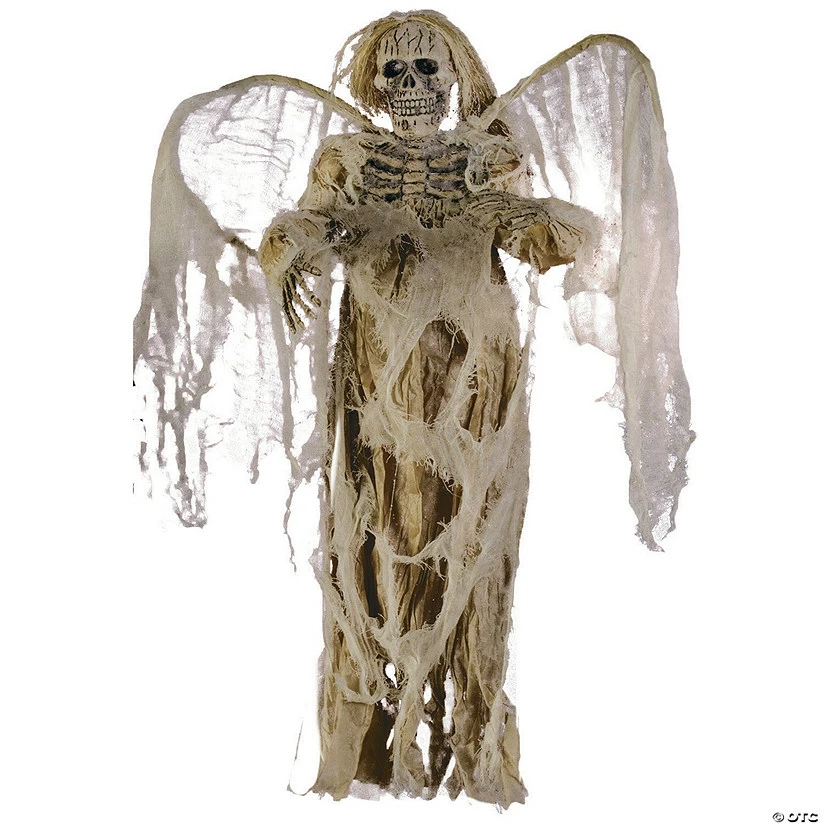 A fleshless face with a blank expression makes this Halloween prop perfect for your haunted house. Skeleton decorations are de rigueur for hosts looking to deck out their costume parties in spine-chilling style. This ivory-colored, eerie “angel” wears a robe with a tattered gauze overlay and features sheer gauze wings. 36″