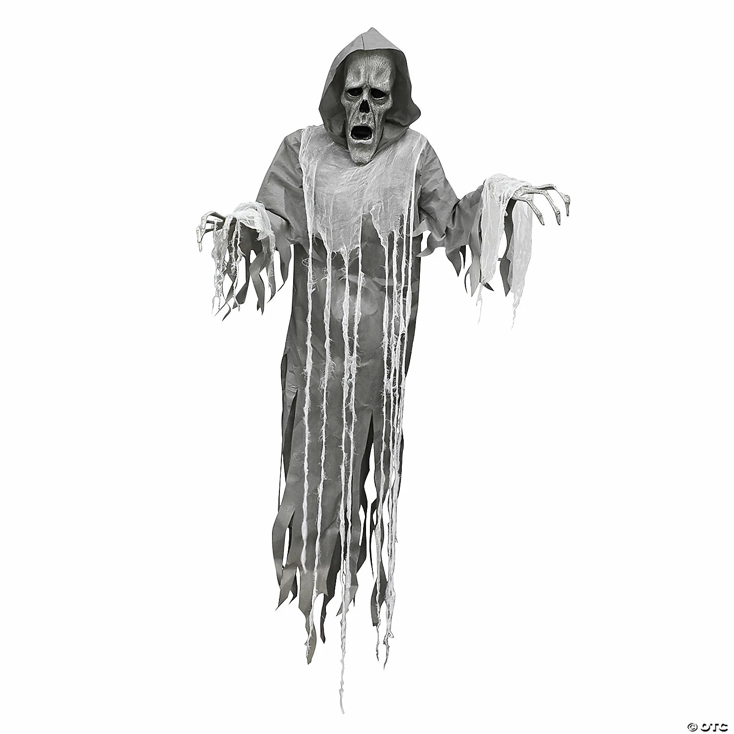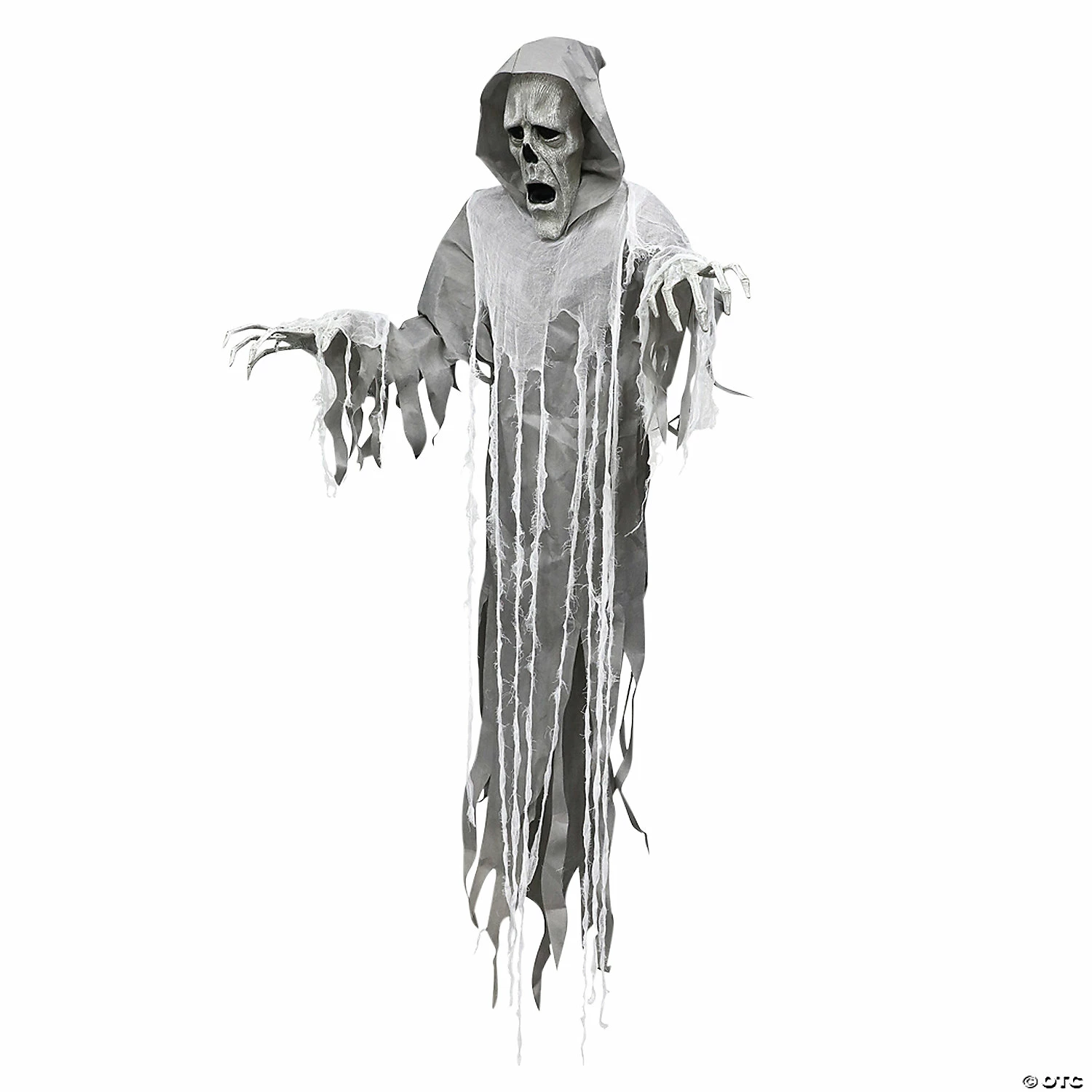 A horrific vision in white, 6-feet of this phantom ghost will haunt your halls. The eerie hallowed moans are motion-activated sound box with controllable volume. The life-size ghoul has blow-molded elongated head and long creepy hands with poseable arms, light-up eyes and draped in layers of white gauze.Special Shipping Information: This item ships separately from other items in your order. Imported.