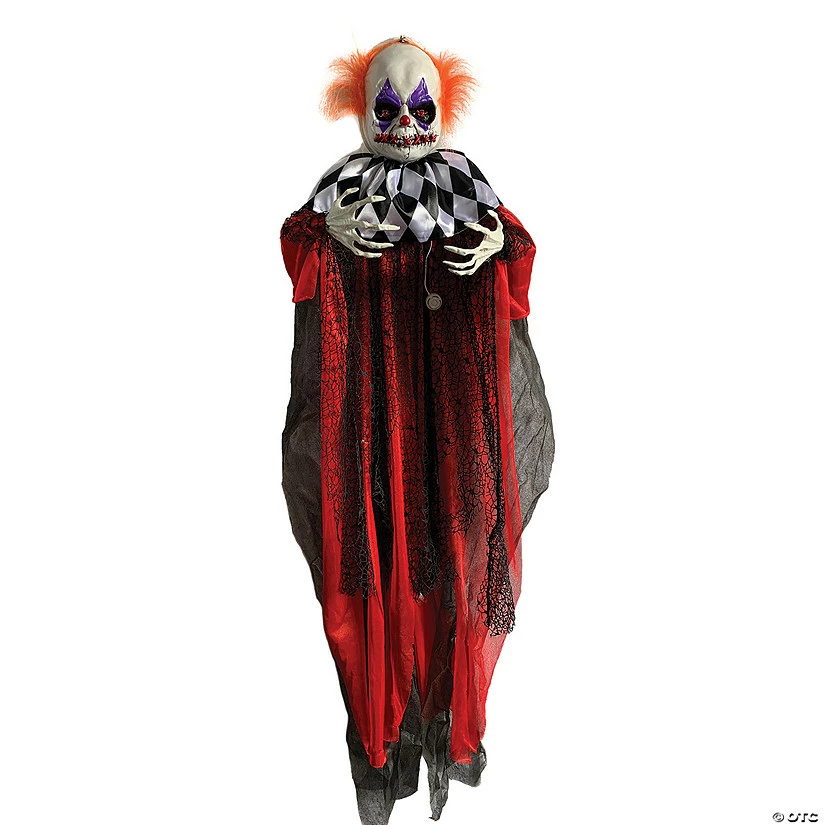 With his Bright Orange Bow Tie and checkered Collar, you can’t miss this colorful 35-Inch Hanging Clown! He has a Skull Face with Red and Blue Makeup and Yellow wispy Hair. His Posable Arms end in skeleton Hands, and his long Purple Drape clothing has a sheer Black gauzy layer to sway in the breeze. Fun accessory for your next Haunted Scene or Home Haunt.