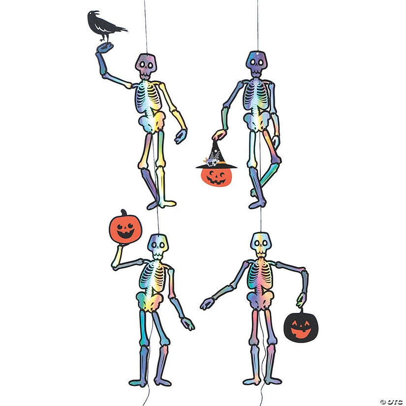 String up these shiny skeleton decorations for your big Halloween bash! This kit includes everything you need to create a customized hanging Halloween decoration. Attach all four skeletons and smaller accessory icons to one string to create a vertical garland, or cut the string into sections to create two or four skeleton decorations to hang separately around the party space. Find more coordinating Halloween party décor here on our site! Includes four 19″ paper skeleton cutouts, five 3″ paper Halloween icon cutouts, 25 ft. string and adhesive squares. Simple assembly required.
