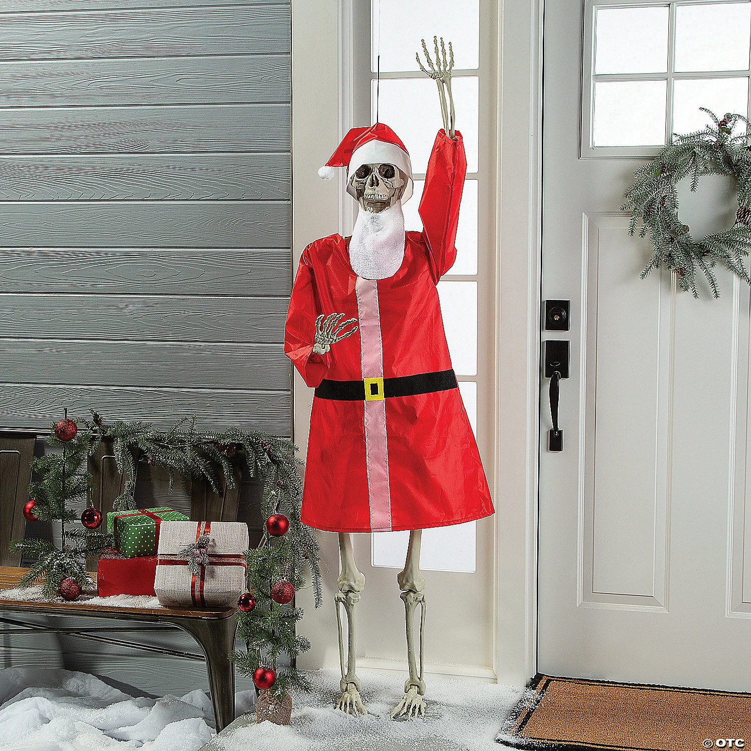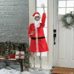A skeleton can deliver far more than Halloween fright. How about some gifts on Christmas Eve night? This Santa outfit is the perfect addition to a posable skeleton and includes a beard, hat and suit. Add the skeleton to your front porch for unique and creepy Christmas home décor or use it as a fun prop for some memorable holiday party photos. Simply pair this outfit with our large posable skeleton on this website! Fits a five-foot skeleton; skeleton sold separately. Nylon. (3 pcs. per set)