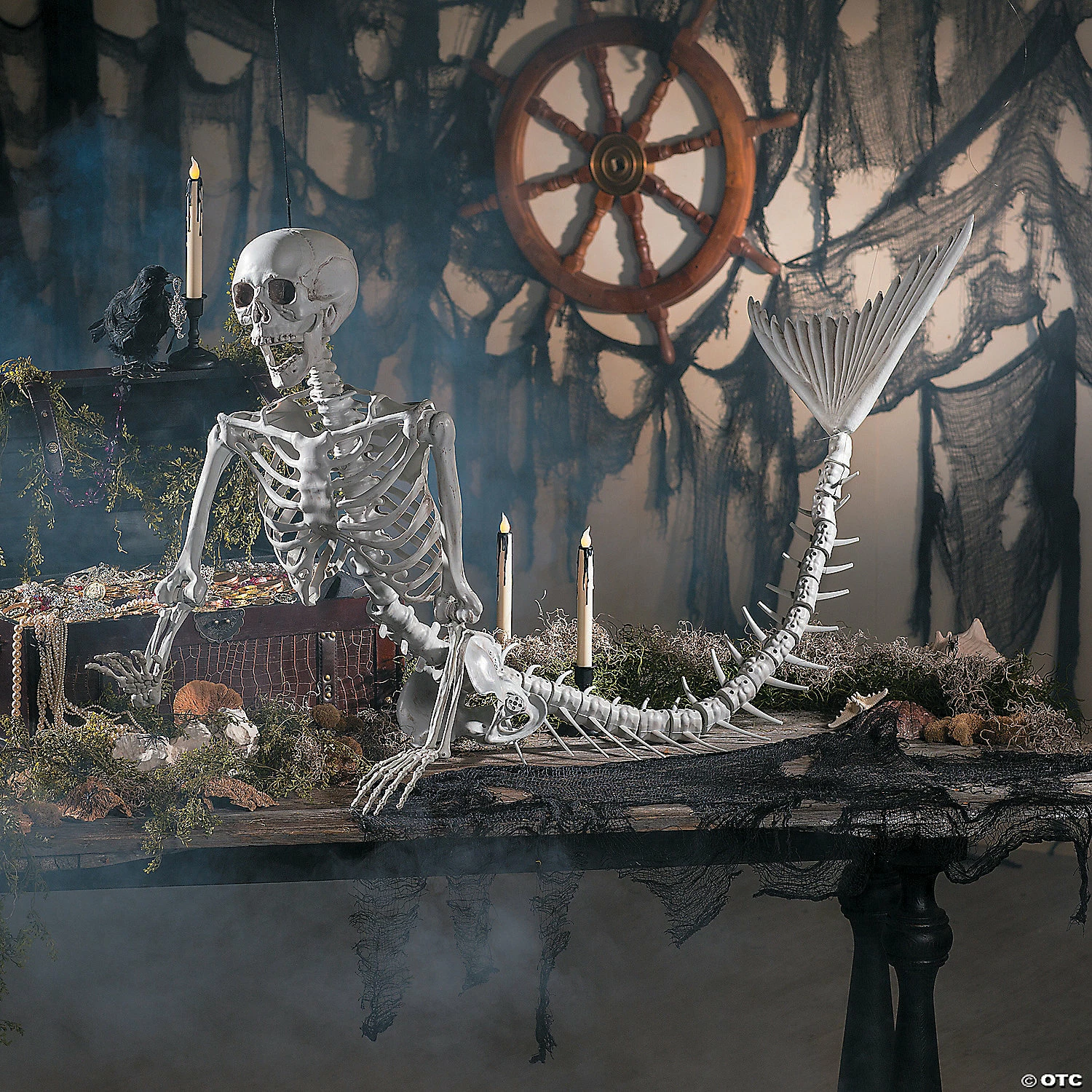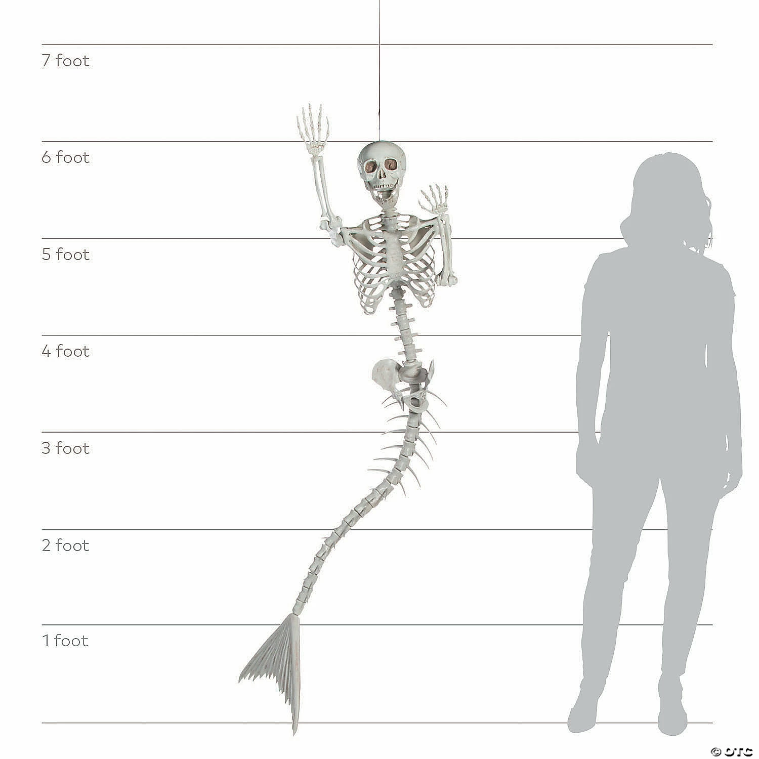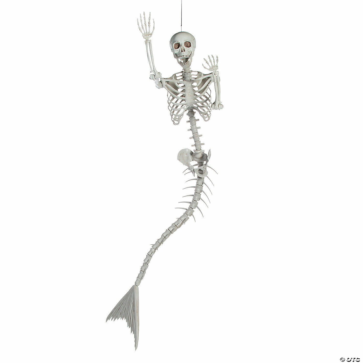 Size: Skeleton; 14 1/2″ x 73″ Skull; 8 1/2″ x 20″ circ.You ever wonder what a mermaid skeleton would look like? No? Well, we did! Many have tried to emulate this beauty, but there is nothing like the original! Add this mermaid skeleton to a spooky Halloween scene! A great addition to your Halloween decorations, you can add it to your porch display and pose it in different settings or spook your Halloween party guests inside! It’s large, so go all out with your setting — we’re talking oceanic details here, people! Plastic. Due to the production techniques, the aged-painting look may vary from piece to piece. © OTC
