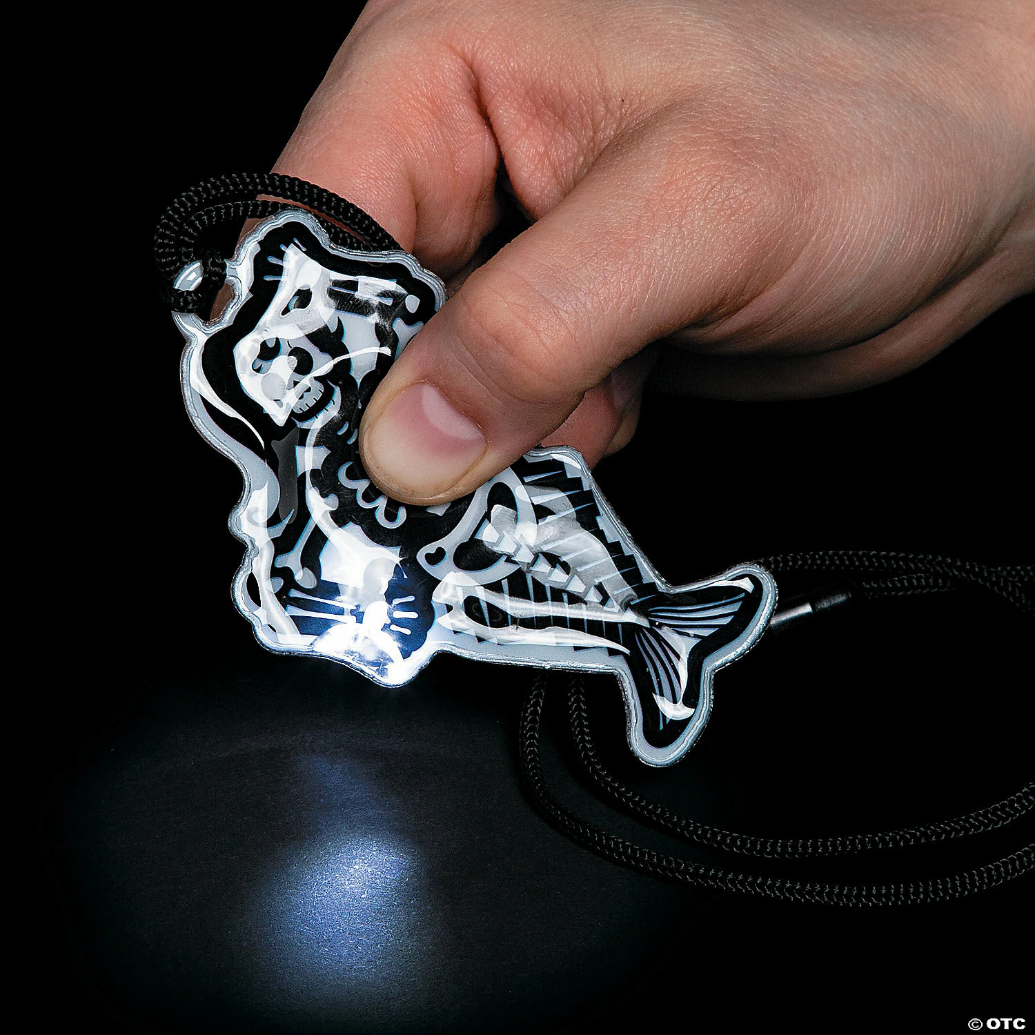 Dive right in to spooky Halloween fun with these Light-Up Skeleton Mermaid Necklaces! Perfect candy alternatives to hand out to trick-or-treaters, these necklaces will help little ones light the way as they make their way around the neighborhood in their Halloween costumes. Plastic. 2 1/4″ x 3″ charms on 24″ circ. nylon breakaway cords. Includes batteries.
