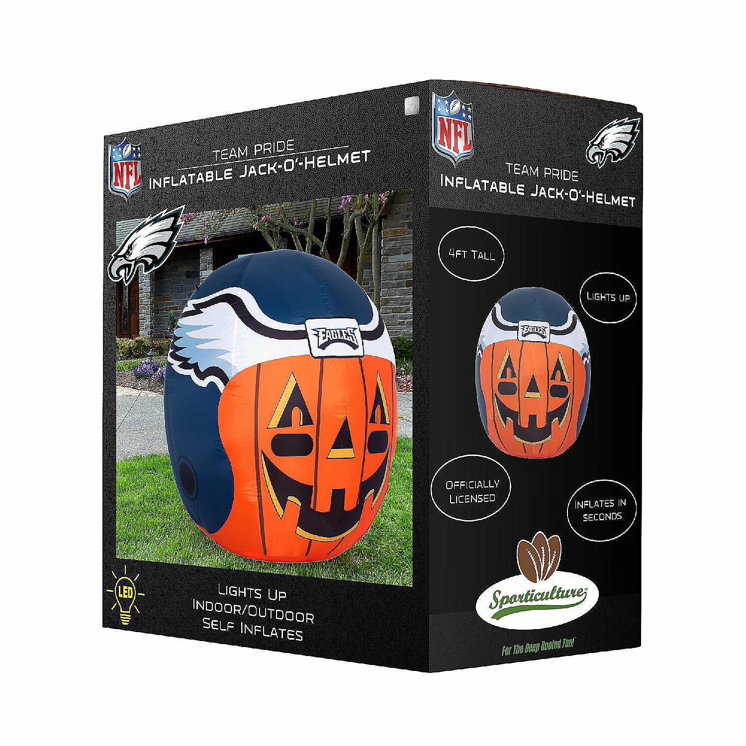 Get ready for fall, football and inflatable fun with the Team Pride Inflatable Jack-O’-Helmet! This four foot officially licensed pumpkin with jack-o’-lantern face and logo graphic helmet inflates in seconds, illuminates with internal LED lights, and deflates for easy storage. Made of durable weatherproof material, it’s the perfect addition to a front yard Teamscape and Halloween décor. Complete with tie down ropes and stakes, you are sure to be the envy of the neighborhood all season long! Makes the perfect gift For The Deep Rooted Fan!