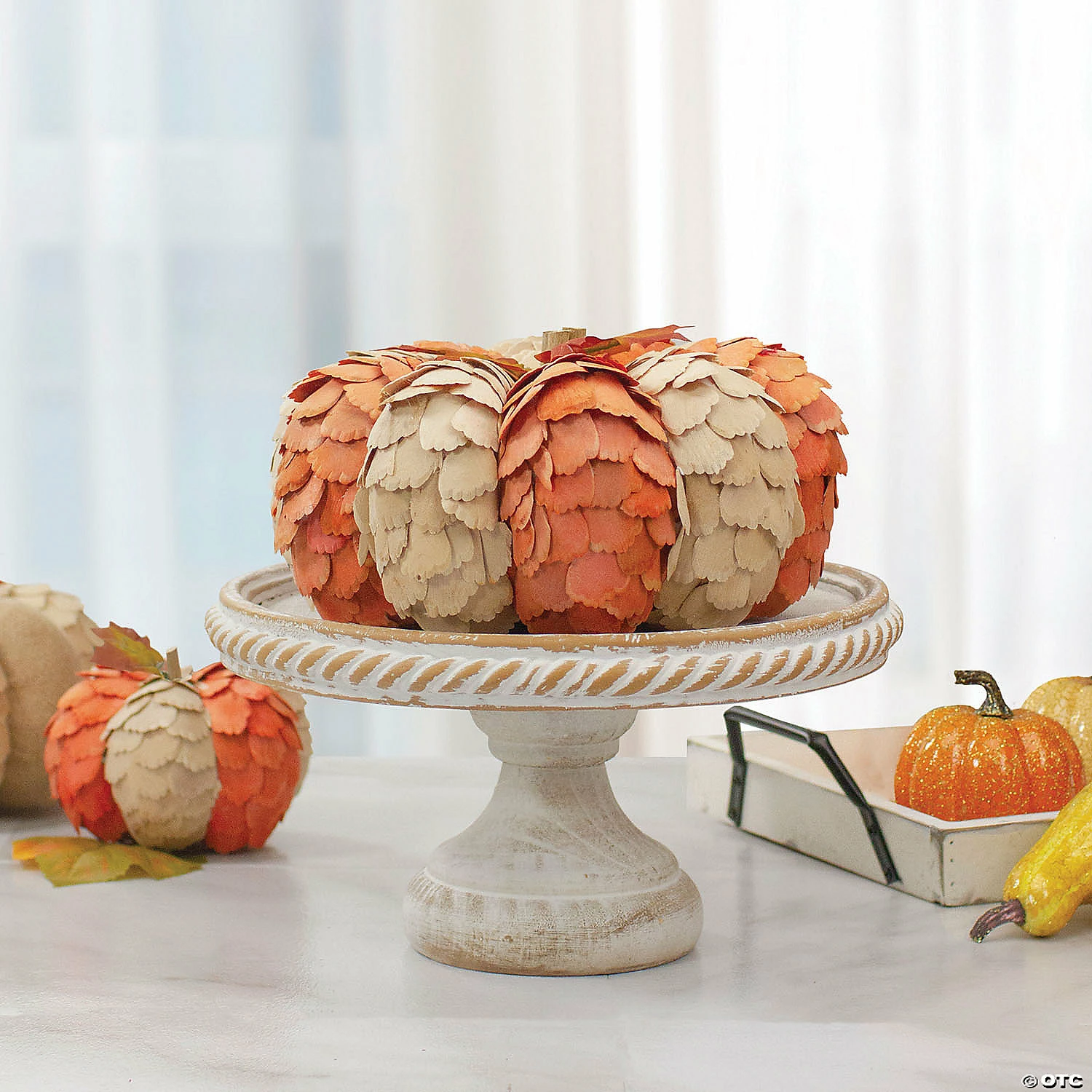 Add this beautiful pumpkin to your fall decorations this year. Perfect to place on any tabletop in your home or to use as a centerpiece. Features: Tabletop pumpkin Yellow and orange leaf Striped pattern Perfect to place on any tabletop in your home Recommended for indoor use only Dimensions: 5.5″ high x 10″ in diameter Material(s): wood