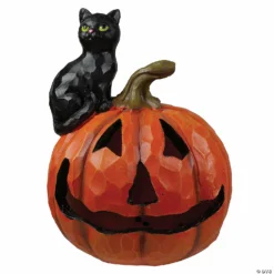 Two of the most iconic symbols of Halloween come together as one in this fantastic depiction. A little black cat gazing up sitting atop the spooky smiling pumpkin face. Celebrate Halloween this year with this light-up jack-o-lantern and black cat tabletop statue! Features: Halloween jack-o-lantern and black cat tabletop decoration Black cat sitting on top of an orange jack-o-lantern Scary smiling jack-o-lantern face Illuminated from the inside by a color changing LED light Hand crafted and painted-slight variations may occur Requires (3) “LR41” button cell batteries – included Dimensions:10″H x 7.5″W x 7.5″D Material(s):polystone- resin mixed with powdered stone additives to give a stone-like finish