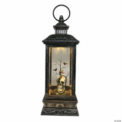 This distressed battery operated lantern is the perfect accent to your Halloween decor. Featuring a spooky skull head with a serpent inside. When switched on the light illuminates the design. Product Features: Weathered black and silver brushed lantern with scroll designs Features a skull head on greenery and rocks A snake and birds perched on black twigs accent the skull Convenient on or off switch is located on the bottom of the base Round handle for hanging and carrying Requires 3 AAA batteries – not included LED warm white light Recommend for indoor use or covered outdoor use Dimensions: 11″H x 4″W x 4″D (excludes handle) Material(s): plastic/acrylic