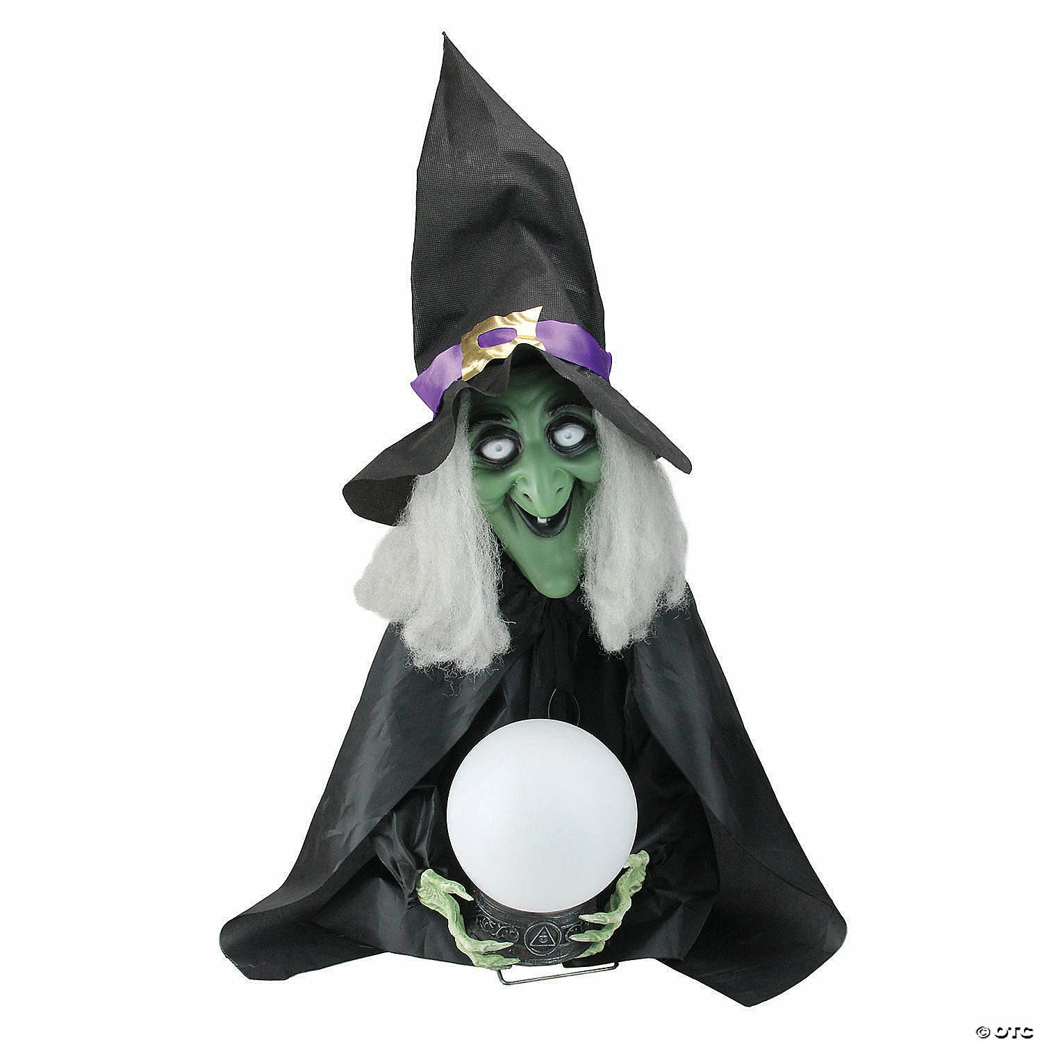 Create a “spooktacular” display this Halloween with this fortune-telling witch. She will frighten everyone she encounters as she sees their future in her magic ball. It is a perfect addition to any haunted house or as part of your home and office decorations!. Product Features: Black and green witch with magic ball Halloween decor. Witch in a sitting position and holding lighted magic ball. Magic ball lights up blue green and purple. Makes a bubbling sound. Green skin witch dressed in a black robe with hat. Easy assembly. Requires 3 “AA” size batteries – not included. Convenient on/off switch on battery pack. Recommended for indoor use only. Dimensions: 26″H x 12″W x 12″D. Material(s): polyester/plastic Special Shipping Information: This item ships separately from other items in your order. This item cannot ship to a P.O. Box. This item may be subject to additional processing days. ITEM IS NOT ELIGIBLE FOR EXPEDITED SHIPPING