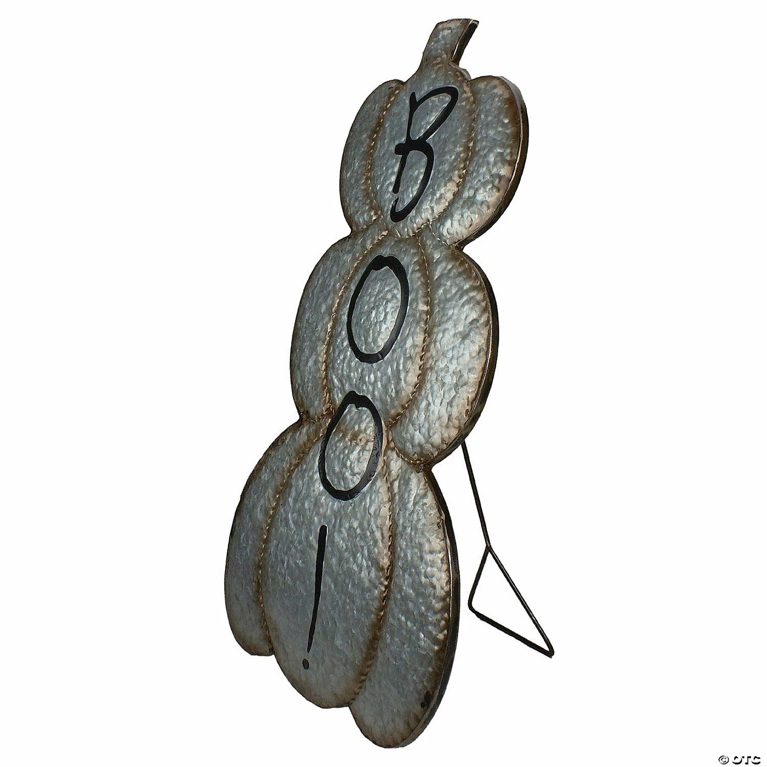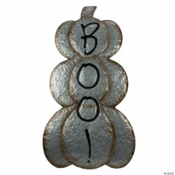 Add a whimsical feeling to your holiday decor with this perfect pumpkin Halloween sign! This unique item displays the word BOO! in a vertical fashion. Perfect for any of your Halloween parties and festivities. Features: Metal pumpkin Halloween decoration Pumpkins are vertically aligned Gray metal accented with brown highlights BOO! written in black down the middle Comes with an attached metal stand Dimensions: 28″H x 16.5″W x 10″D Material(s):metal