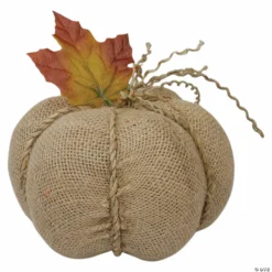 The perfect table top or mantle piece to add an autumn touch to your holiday decor. This pumpkin is free standing and has a burlap textured design. The neutral beige tone will compliment any country rustic setting. Features: Beige burlap pumpkin Accented with an orange and yellow leaf Topped with a wooden stick for the stem Accented with twisted jute rope Recommended for indoor use Dimensions: 3.5″ high x 5.5″ diameter Material(s): burlap/polyester/jute/paper