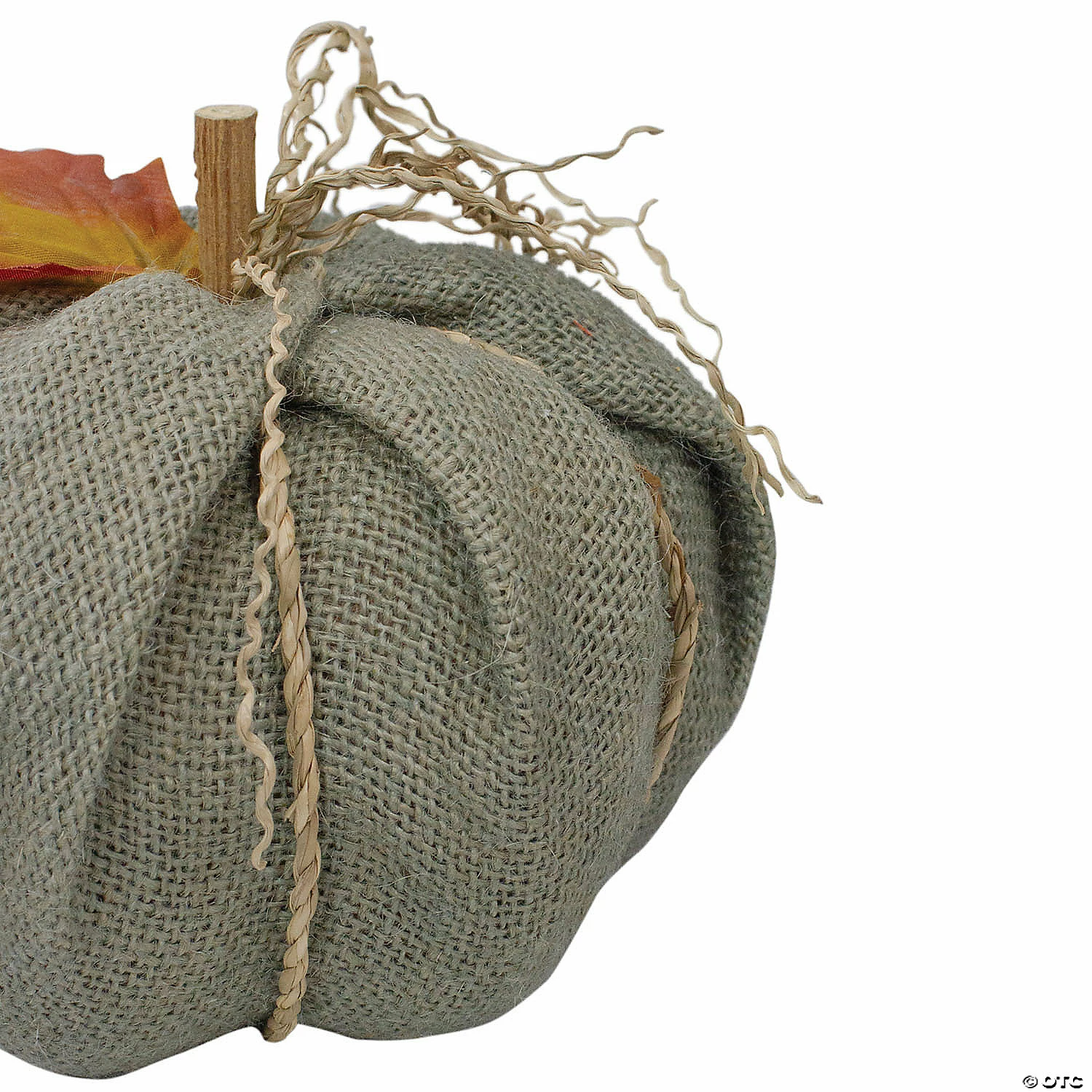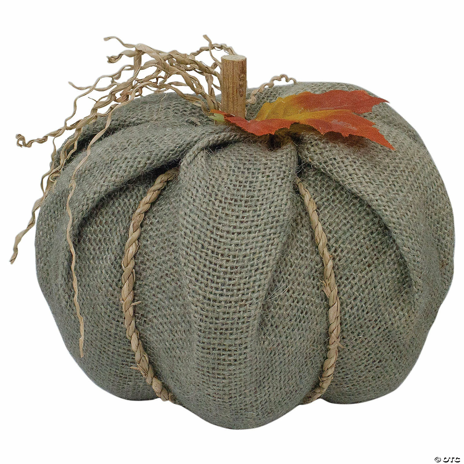 The perfect table top or mantle piece to add an autumn touch to your holiday decor. This pumpkin is free standing and has a folded burlap design. The neutral gray tone will compliment any country rustic setting. Features: Green burlap pumpkin Accented with an orange and yellow leaf Topped with a wooden stick for the stem with jute rope accents Recommended for indoor use Dimensions: 5.5″ high x 6.75″ diameter Material(s): burlap/polyester/jute/paper