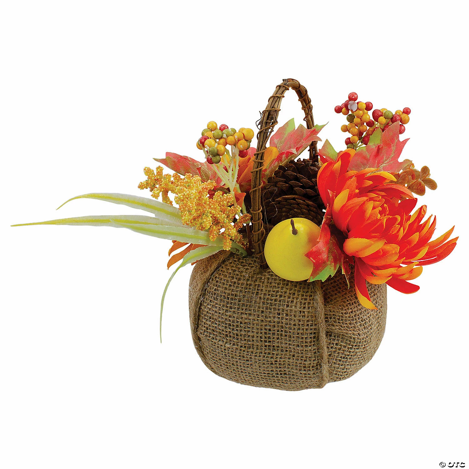 Everyone should take the time to watch the turning of the leaves in the Autumn. This basket perfect for decorating for Thanksgiving features chrysanthemums a pomegranate a pear berries and a pinecone. You can capture the essence of a crisp fall day with this lovely pumpkin basket. Exploding with color this table decoration is sure to add a pop of color to your decor. Product Features: Tabletop pumpkin basket decoration. Burlap pumpkin base with a grapevine handle. Filled with yellow and orange chrysanthemums, a pomegranate, a pear, and a pinecone. Accented with grass blades, heather buds, maple leaves and berries. Recommended for indoor use only. Dimensions: 9″H x 10″W x 5.5″D. Material(s): burlap/foam/plastic.