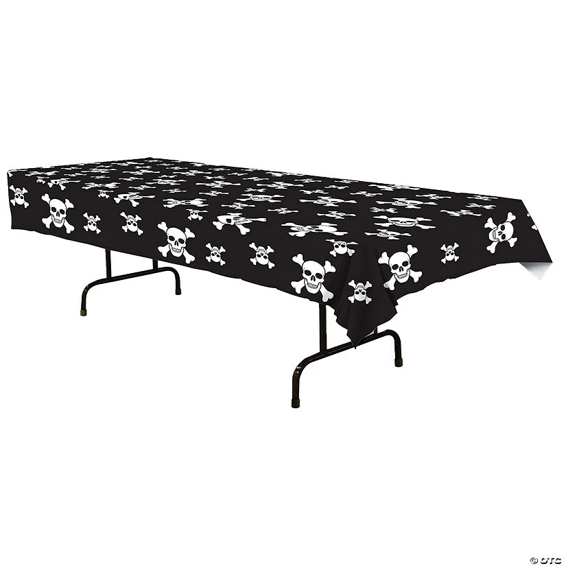 Plastic . A great table-covering for a pirate themed party. Includes: One table cover featuring white skulls and crossbones on a black field. Made of Plastic. Measures 54x 108.Special Shipping Information: This item ships separately from other items in your order. This item cannot ship to a P.O. Box. This item may be subject to additional processing days.ITEM IS NOT ELIGIBLE FOR EXPEDITED SHIPPING